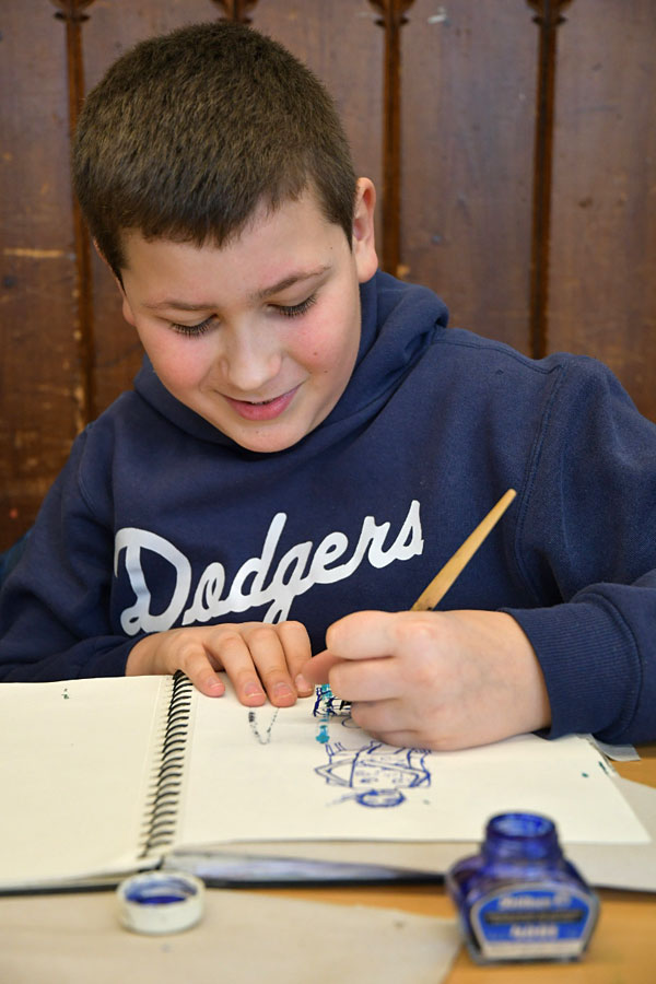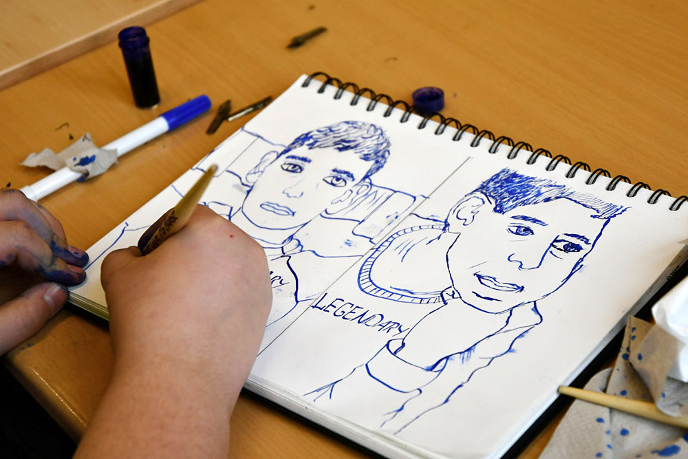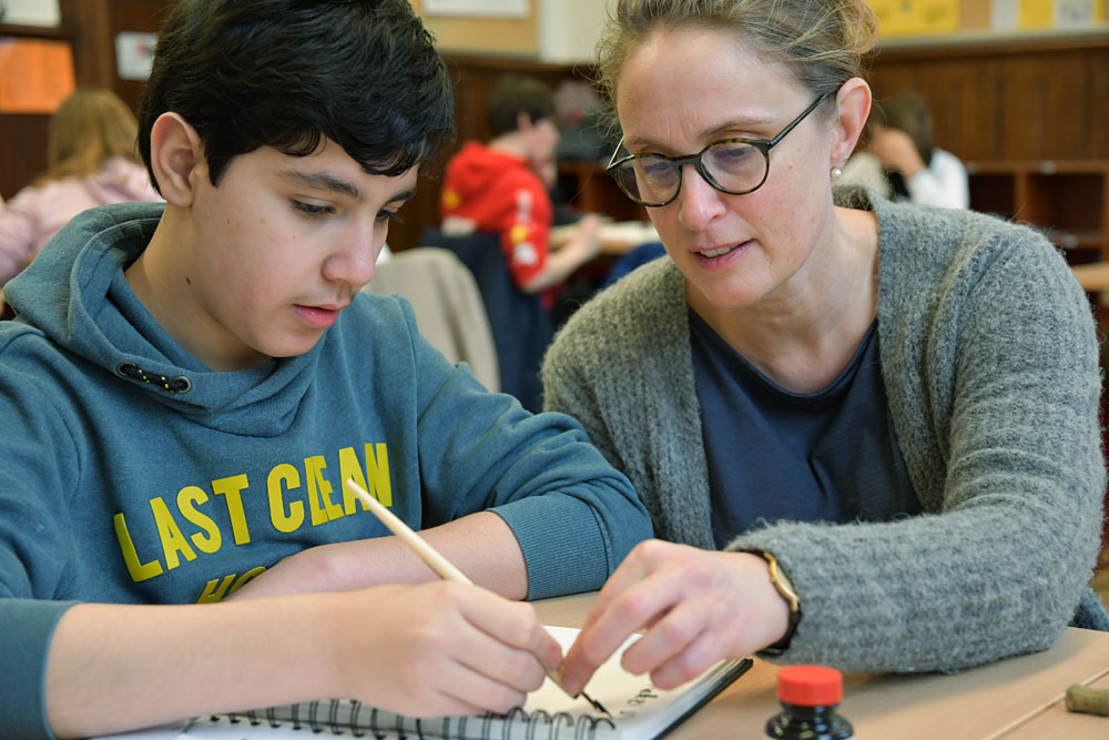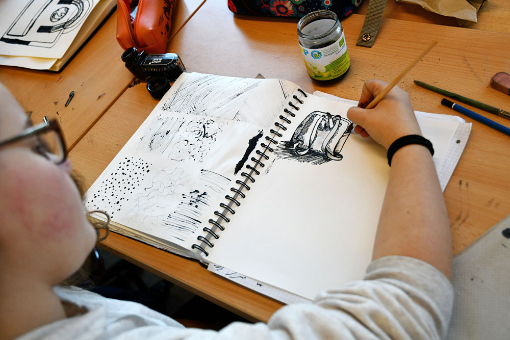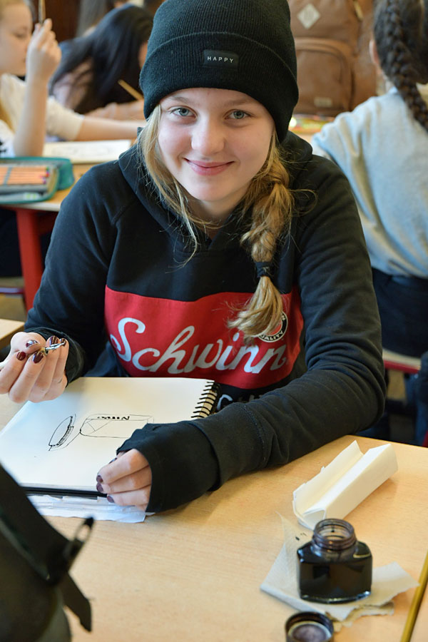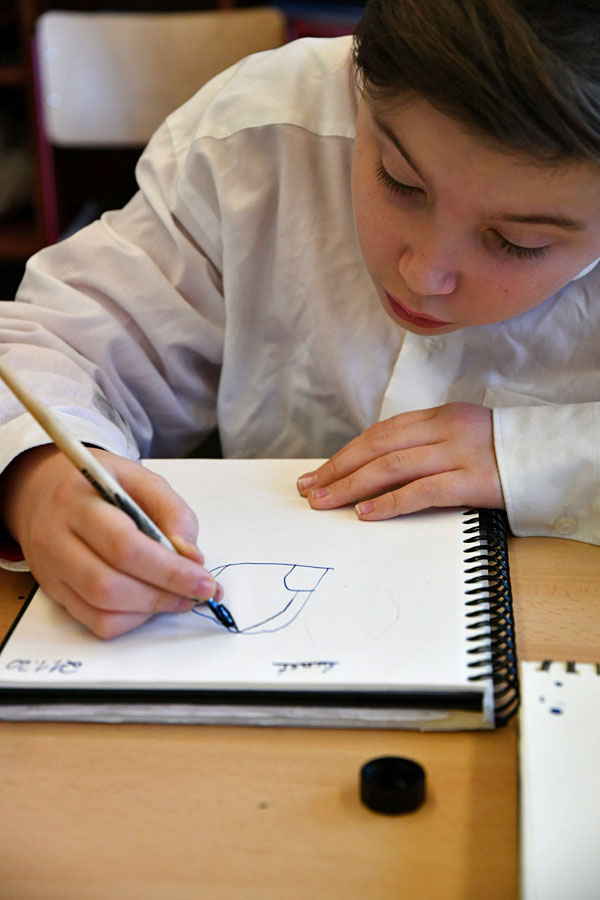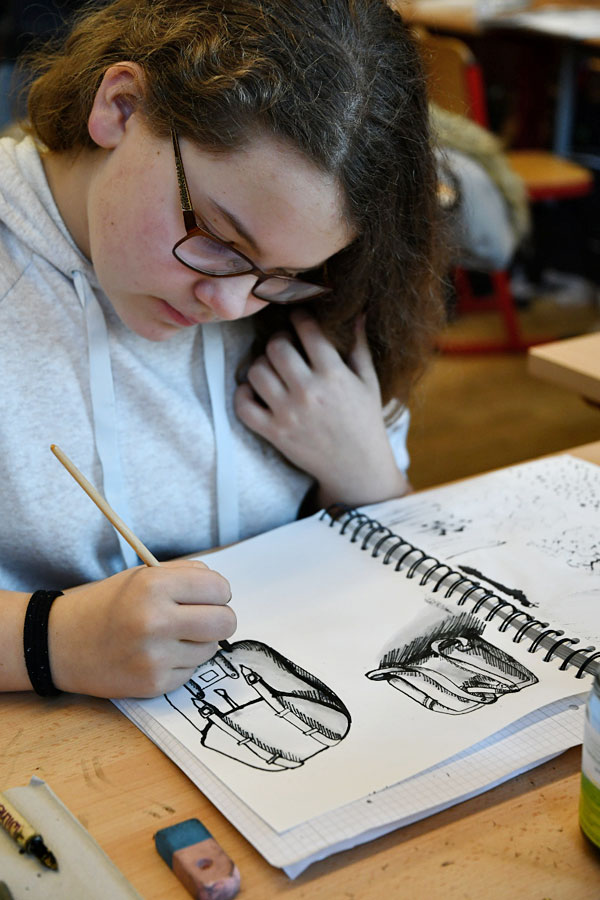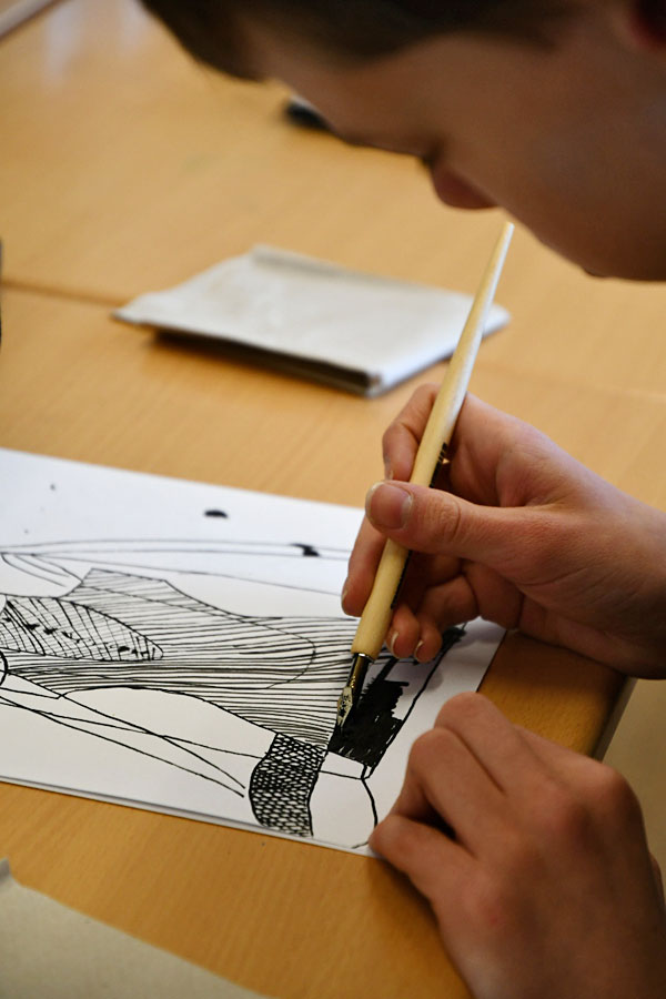 Im ersten Schulhalbjahr durfte die Fachgruppe Kunst dank der finanziellen Unterstützung des Fördervereins Klassensätze an Zeichenfedern in sieben verschiedenen Stärken sowie den zugehörigen Federhaltern anschaffen. Mit Übungen in der Federzeichnung wird das Curriculum des 7. Jahrgangs zum Beispiel beim Thema „Linie“ oder „Objektdarstellung“ erweiterbar und lässt sich somit nun noch facettenreicher gestalten. Erstmals wurden die Zeichenfedern in der Klasse 7e ausprobiert und fanden reichlich Zuspruch. Frau Herrmann, die erste Vorsitzende des Fördervereins, hat die 7e in einer Kunststunde besucht und war vom Arbeiten der Schülerinnen und Schüler sichtlich angetan. Zeichnen macht einfach Spaß – mit Bleistift, Finelinern, Kugelschreibern, … und nun auch mit Zeichenfedern!