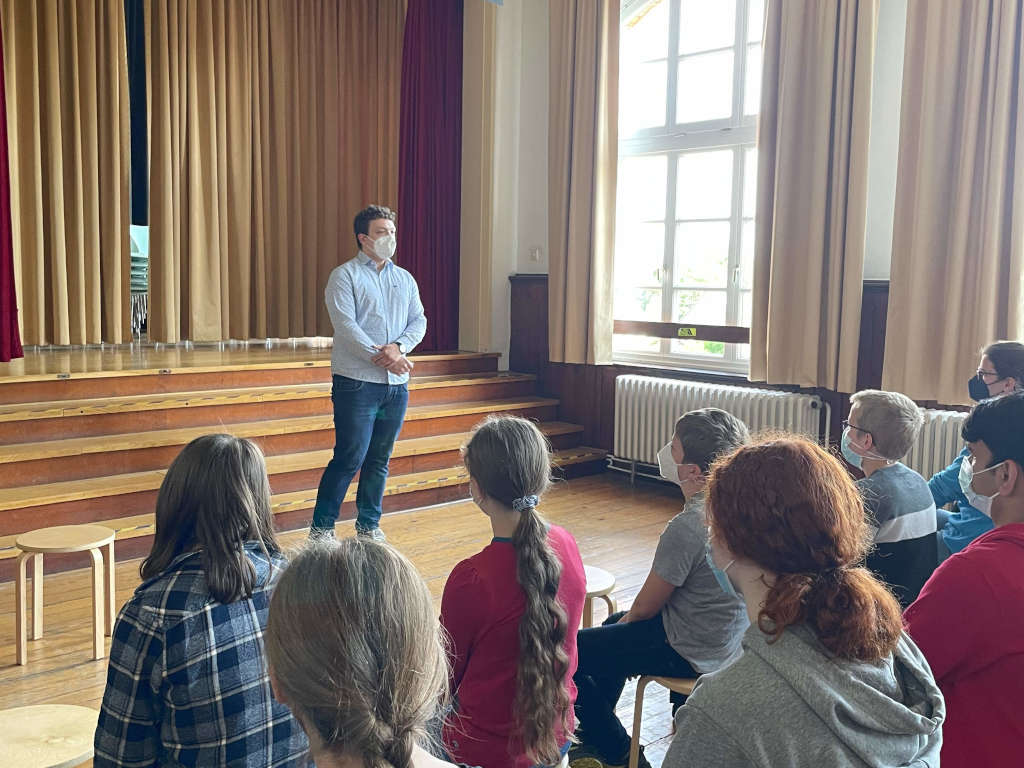 In diesem Jahr konnten wir als Gastredner Daniel Homann begrüßen. Herr Homann schilderte seinen Werdegang vom Teilnehmer bis zum Organisator der Mathematik-Olympiade, gab interessante und kurzweilige Einblicke in sein Studium und wie die Mathematik seine beruflichen Aufgaben prägt. Drei Abiturient:innen dieses Schuljahres waren extra für die Feierstunde noch einmal in die Schule gekommen und ihre kontinuierliche Teilnahme an der Mathe-Olympiade wurde gebührend geehrt.