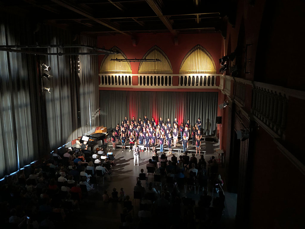 Nach zweieinhalb Jahren konnten die Chorklassen endlich wieder vor Publikum singen. Am 30. Juni präsentierte WG Cantorum 5/6 in der bis auf den letzten Platz besetzten Aula des Haupthauses ein buntes Programm von Liedern, die in diesem Halbjahr – insbesondere auf der Chorfahrt im Mai – geprobt worden waren.