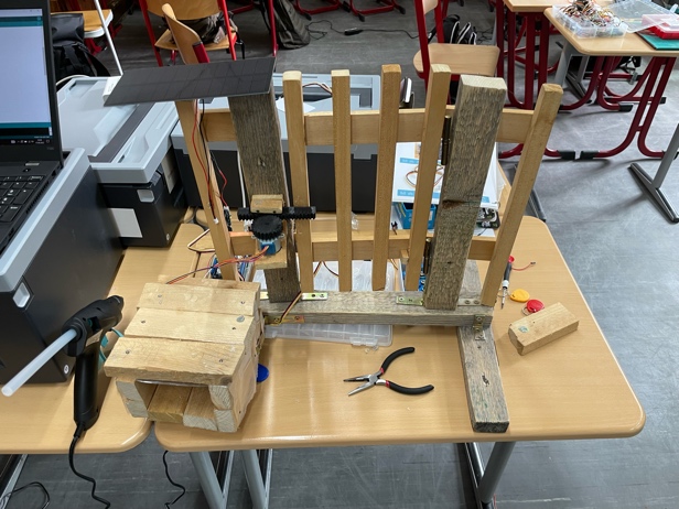 Auf ein anfängliches Kennenlernen folgte am ersten Tag die Ideenfindung. Die Auseinandersetzung mit auftretenden Problemen im normalen Schulalltag führte uns Schüler*innen in einer zweiten Phase zu konkreten Lösungsansätzen. Damit die Umsetzung dieser für uns größtenteils unbekannten Hard- und Software nicht scheiterte, sollten wir in vereinfachter Form mithilfe von beschrifteten Quartett-Karten einen Schaltplan legen, der die Kategorien Input, Rechencenter und Output vollends abdeckte. Nach einer kurzen Präsentation der Ideen und Lösungsansätze im Plenum konnte die Theorie in die Praxis umgesetzt werden. Je nach Projekt bedeutete dies, verschiedene Sensoren mit dem Rechner zu verbinden, Datenbanken zu programmieren oder essenzielle Schweiß- und Werkarbeiten zu erledigen. Stets mit richtigem Gerät ausgestattet erstreckte sich diese Phase über ca. zweieinhalb Tage, in denen nicht nur die Ausstattung und Unterstützung seitens der Mentoren*innen und Lehrer*innen klasse war, sondern auch die Pizza, die uns am Anfang jeder Mittagspause erwartete. Auch wenn während des Arbeitsprozesses das ein oder andere Detail einen zur Weißglut brachte, konnte jede Gruppe am Freitagnachmittag ein sehenswertes Ergebnis präsentieren.