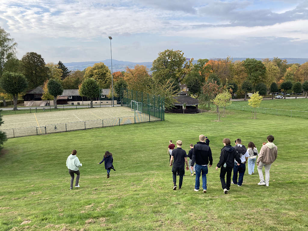 Nach einer kurzen Stadterkundung in Holzminden, begaben wir uns zum Internat, das schön gelegen über dem Städtchen thronte und tatsächlich ein bisschen an die Hogwarts-Schule für Hexerei und Zauberei erinnerte. Nur Zauberer gab es keine. Aber freundliche Menschen rund herum, wie Herrn Schmitz, ein Lehrer des Internats, der uns das beeindruckende Grundstück (50 ha) und die zahlreichen, imposanten Gebäude zeigte: mehrere Speisesäle, Teestube, Töpferei, Schreinerei, Bibliothek mit Lernzentrum, Tennisplätze, Sportplätze, Sternwarte, Kino, Reithalle, Bogenschießanlage, Reitplatz und noch vieles mehr. Eine Schule mit umfangreicher Infrastruktur, fast wie das Wilhelm-Gymnasium.