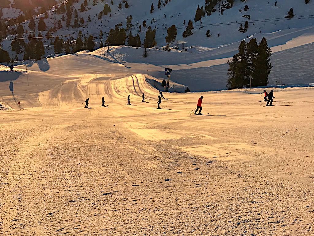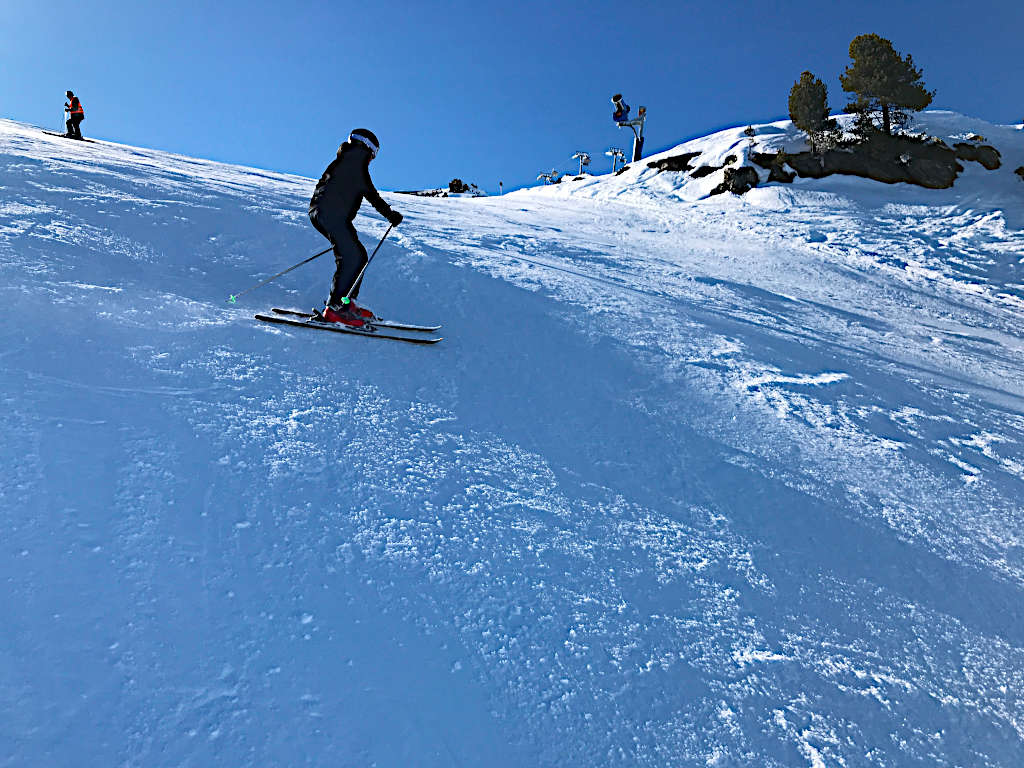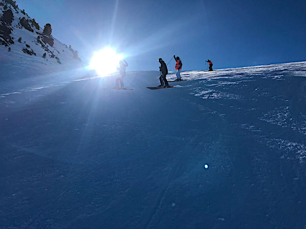 In der Loipe bei blauem Himmel und Sonnenschein lernten wir schnell das Skifahren ein.