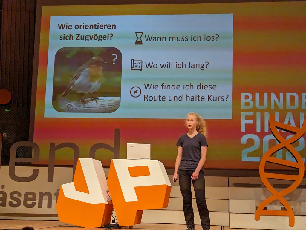 Mitte September stand dann das Bundesfinale in Berlin an. Zum Überthema „Mit allen Sinnen“ überlegten sich alle 125 qualifizierten SchülerInnen neue Präsentationen. Carolina blieb ihrem Tierthema treu und entschied sich für die Fragestellung „Wie orientieren sich Zugvögel?“. Dazu musste sie zunächst ein Präsentationsvideo hochladen und die Präsentation dann vor einer dreiköpfigen Jury in Berlin live halten. Das machte sie so gut, dass sie zu den besten sechs Präsentierenden gewählt wurde, die dann am Sonntag vor großem Publikum und im Livestream gegeneinander antraten.