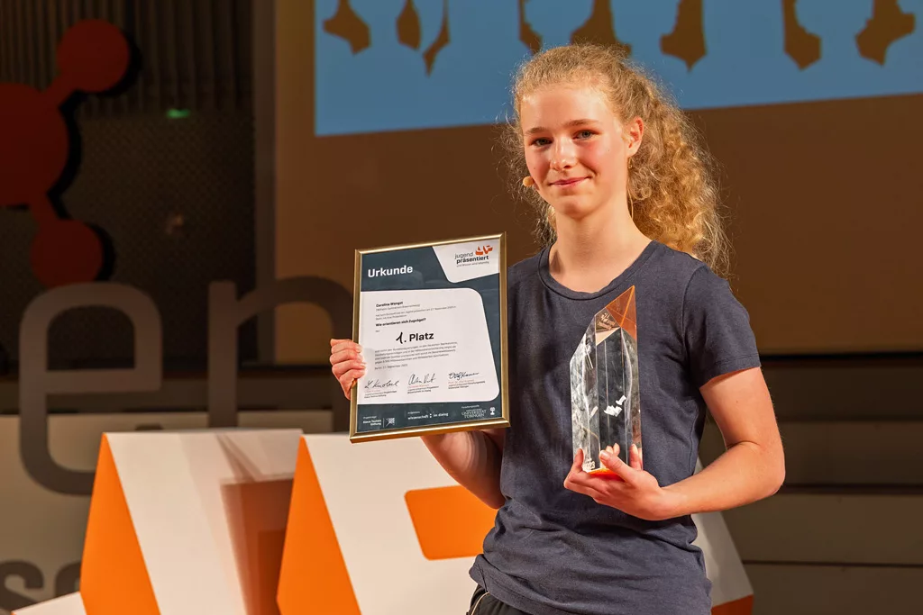 Dies meisterte Carolina so bravourös, dass sie am Ende von der sechsköpfigen, professionellen Jury zur Bundessiegerin 2023 gekürt wurde. Damit hat sich Carolina gegen 8458 MitstreiterInnen aus allen Bundesländern und auch aus dem Ausland durchgesetzt! Wir gratulieren ihr ganz herzlich zu dem verdienten Sieg und freuen uns, dass Carolina damit „den Pokal“ für unsere Schule (nach dem letztjährigen Sieg durch Ben Fischer) verteidigt hat!