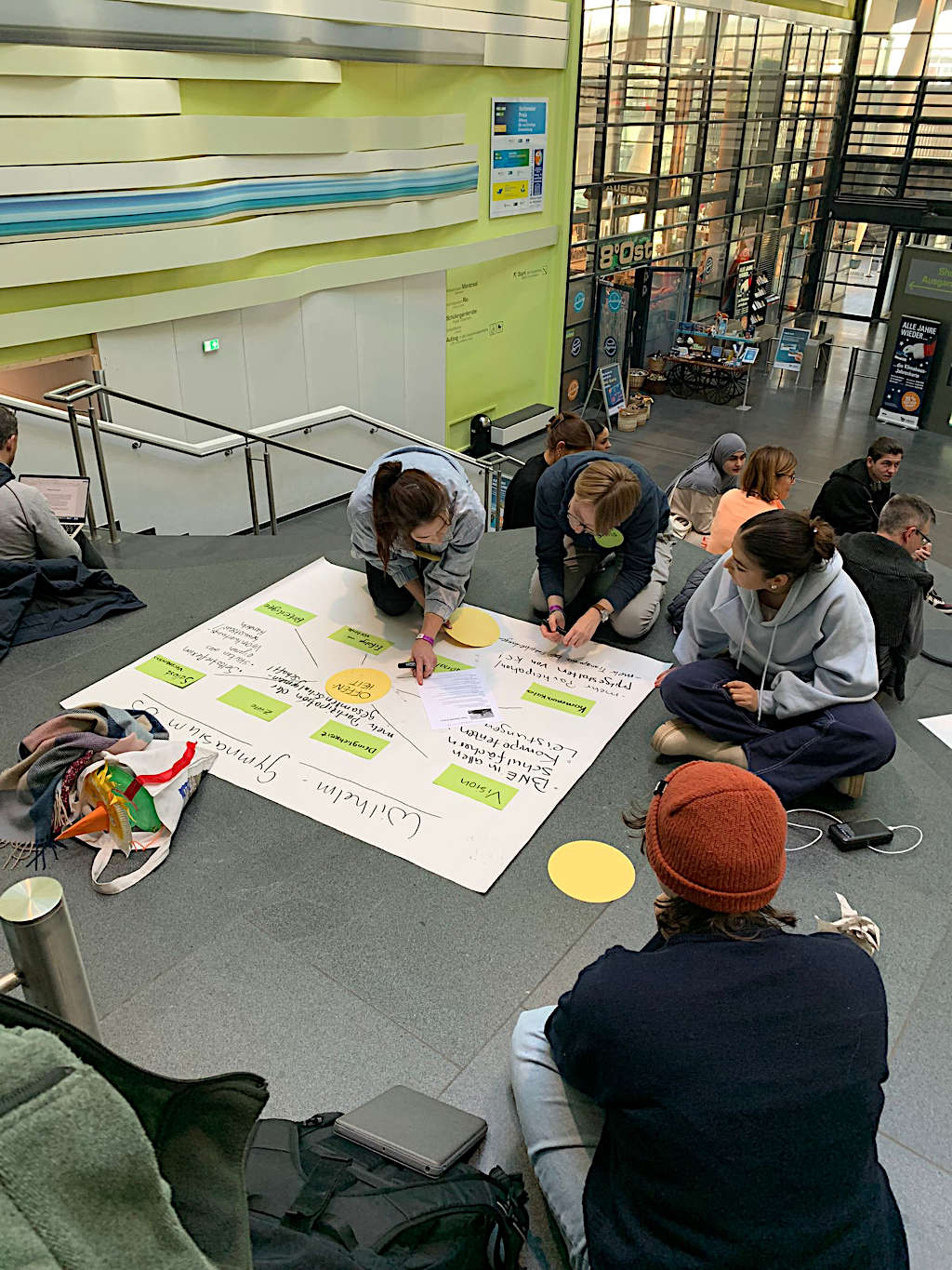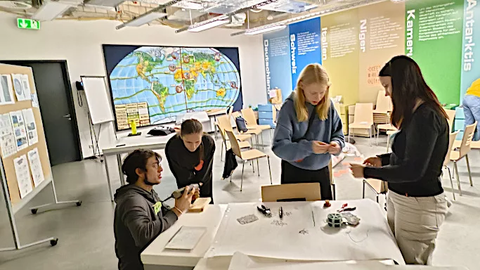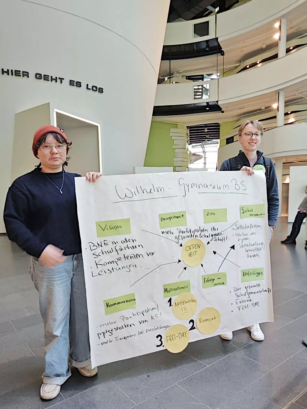 Nach der zweistündigen Workshop-Phase trafen sich alle Teilnehmer und Teilnehmerinnen des Summits im Kongressraum, um ihre Erfahrungen miteinander zu besprechen und zu reflektieren. Im Anschluss daran stellten weitere Referenten und Referentinnen ihre Workshops vor. Safa Sammie, Inken Hihn, Lilith Lübeck und Frau Winter nahmen im zweiten Durchlauf gemeinsam am Workshop „Vom Flaschendeckel zum Lampenschirm? Im ‚Creative Lab‘ dem Plastikabfall ein neues Leben schenken“, teil. In diesem Workshop ging es darum, aus Plastikabfällen schöne und langlebige Dinge herzustellen. Wir durften kreativ werden und aus Plastikplatten eigene Gegenstände basteln. Lilith und Frau Winter bauten gemeinsam einen Beistelltisch, Safa und Inken versuchten sich an einer Konstruktion aus Holz und Plastik. Mia und Elenore waren zur gleichen Zeit auf einer Reise um die Welt, indem sie die gesamte Ausstellung („die Reise“) des Klimahauses erkundeten. Stella nahm am Workshop „Gegen die Ohnmacht: Transformatives Lernen mit dem Whole School Apporach“, teil. Im Fokus dieses Workshops stand die Vorstellung des „Klimarates“ und weiterer transformativer Handlungsmöglichkeiten für die Umsetzung des Whole School Approaches.