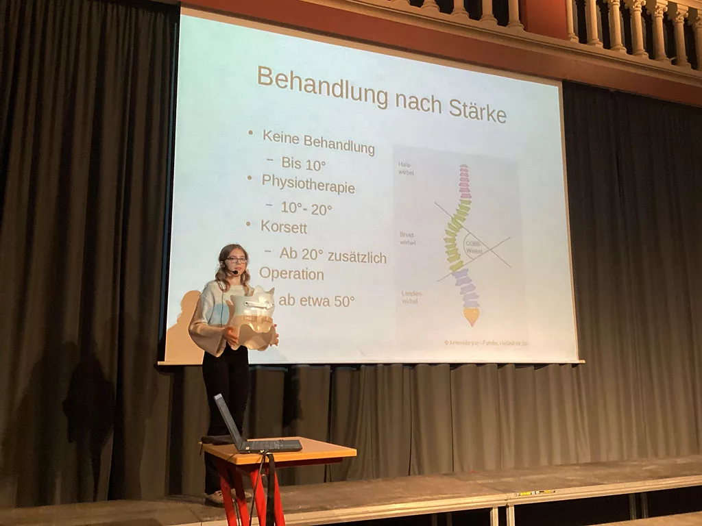 Die Themen der Präsentationen waren sehr vielfältig, so ging es zum Beispiel um Atombomben, Schwarze Löcher und den Stimmbruch. Die diesjährige Siegerin war Karolin Haase (8m2) mit der Frage „Wieso spritzt man bei Diabetes Insulin?“ knapp vor Mia Becker (8m1; 2. Platz: „Wie entstehen multiresistente Keime?“) und Lina Koppe (8m1; 3. Platz: „Was ist Skoliose?“). Alle TeilnehmerInnen am Schulfinale haben jeweils eine Urkunde und einen Buchpreis erhalten.