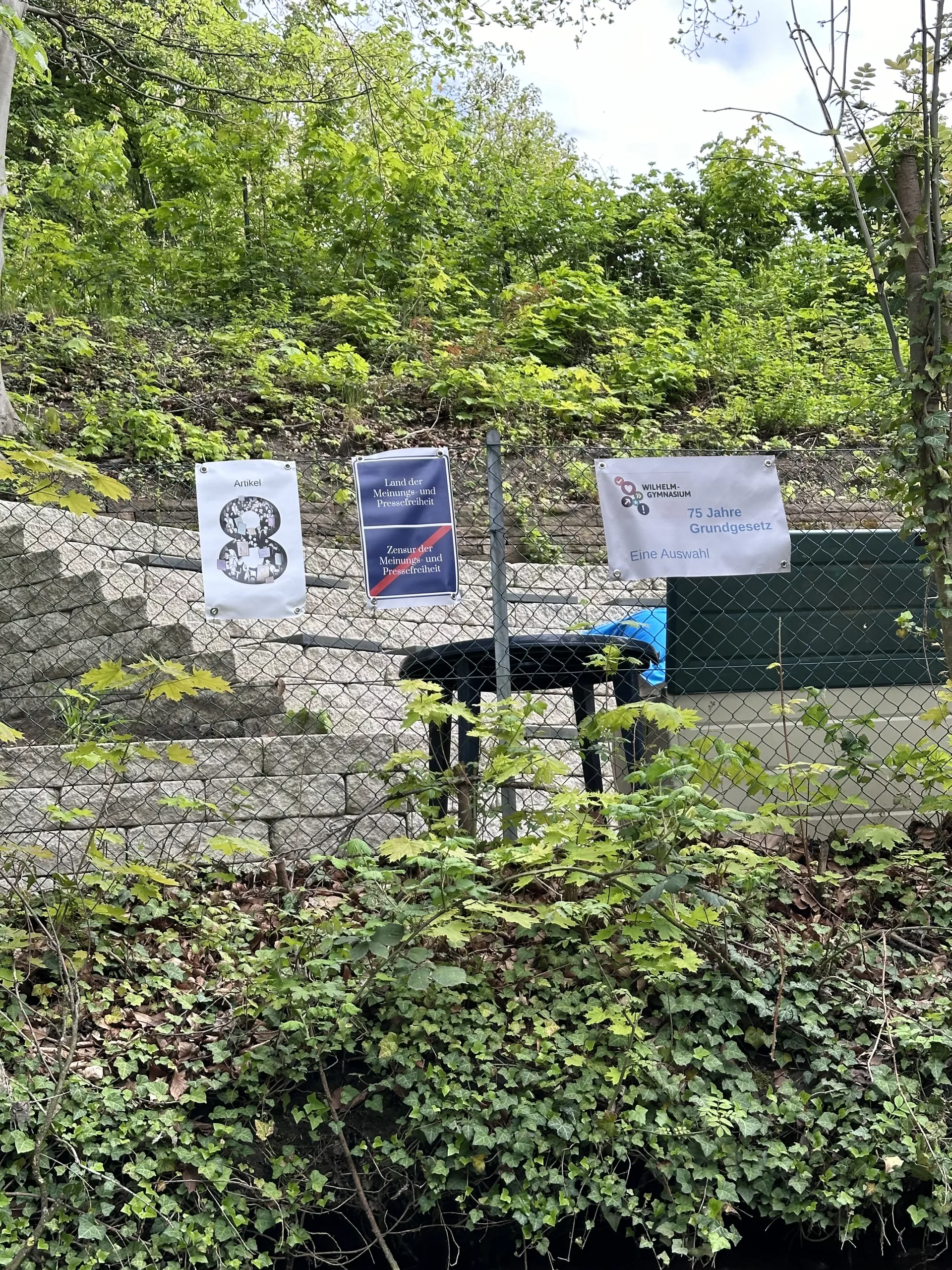 Anlässlich des 75. Geburtstages des Grundgesetzes am 23.05.2024 hat der Geschichtskurs Ge5 eine Aktion durchgeführt. Es wurden selbst entworfene Schilder zu verschiedenen Artikeln des Grundgesetzes im Schulgarten aufgehängt. Ziel ist es, die vielen Menschen, die in ihrer Freizeit auf Tretbooten, Kanus oder Flößen auf der Oker unterwegs sind, zu erreichen. Als UNESCO-Projektschule wollen wir an den Geburtstag unseres Grundgesetzes erinnern.