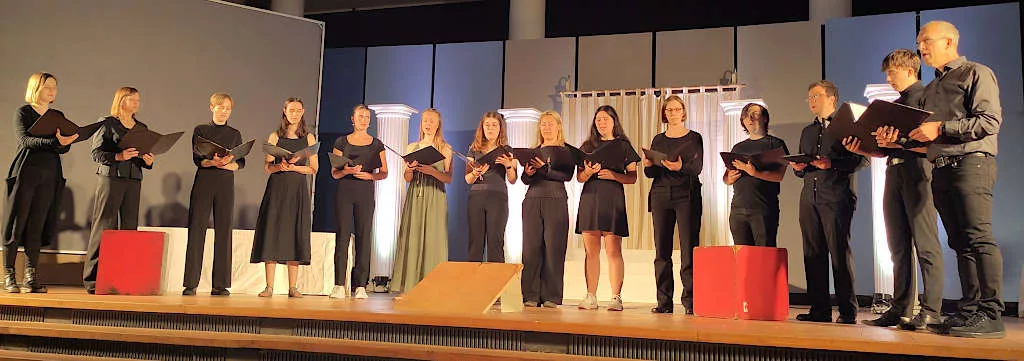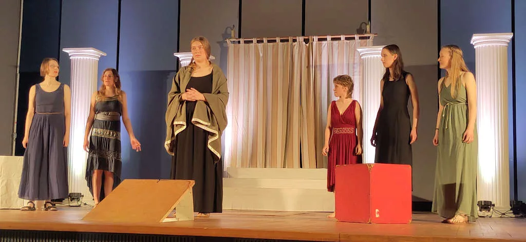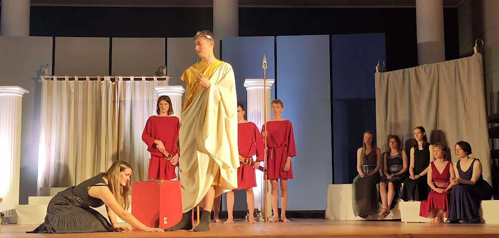 Zum Abschluss kamen wir in den Genuss einer Vorpremiere: Unterstützt von einem wohlklingenden Projektchor bot uns die Theater-AG des KWR in einer originalnahen Version (auf Deutsch) eine beeindruckende und ergreifende Vorstellung des ersten Aktes aus dem antiken Drama „Medea“ von Euripides.