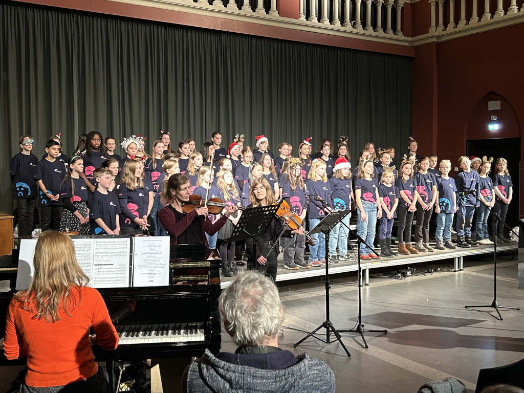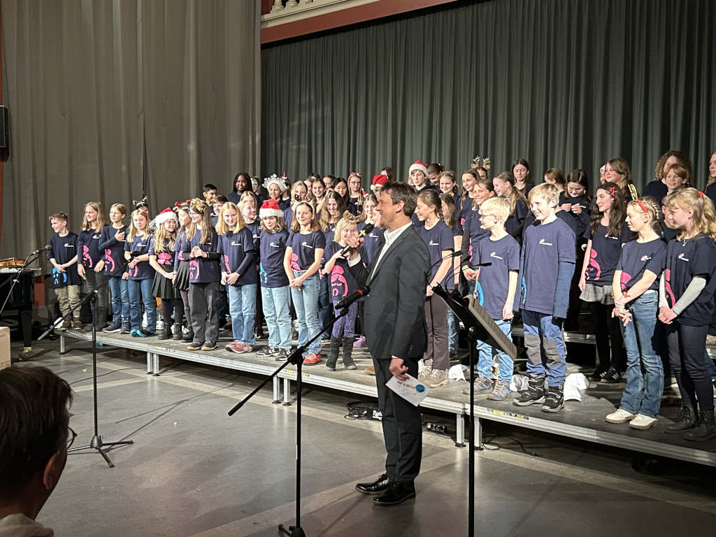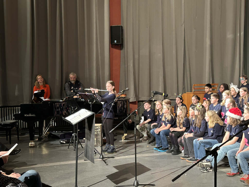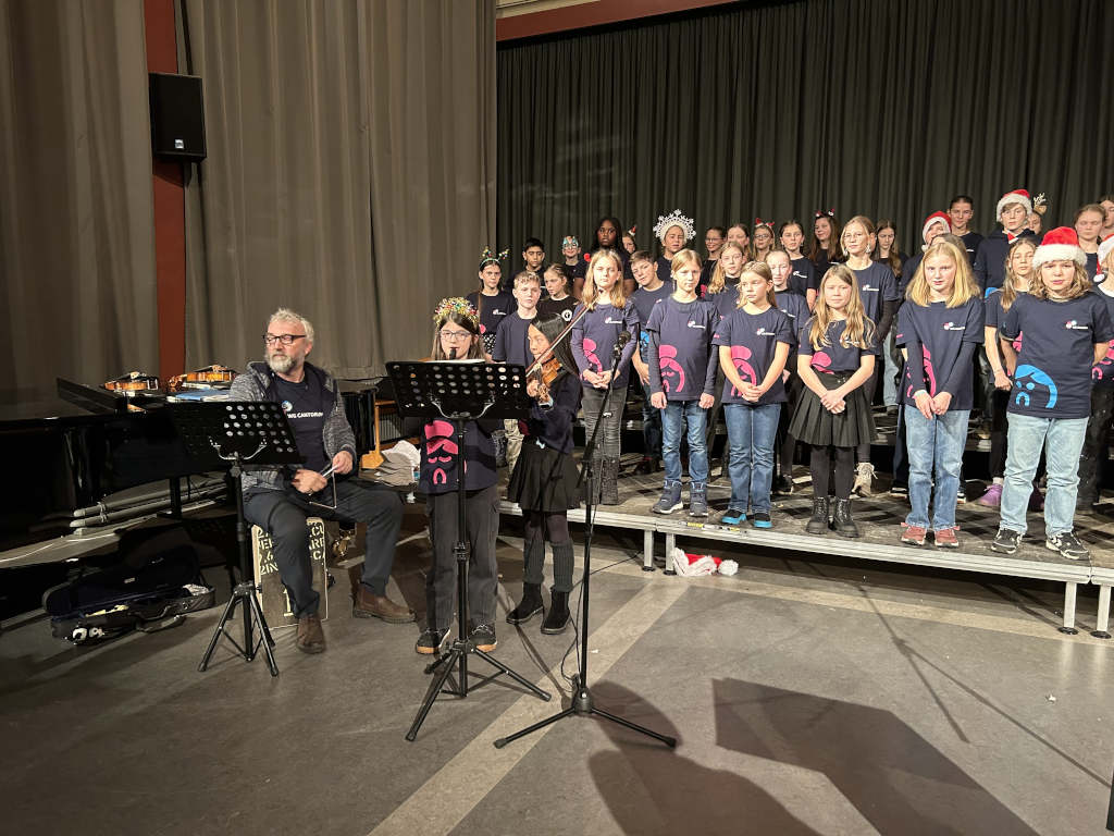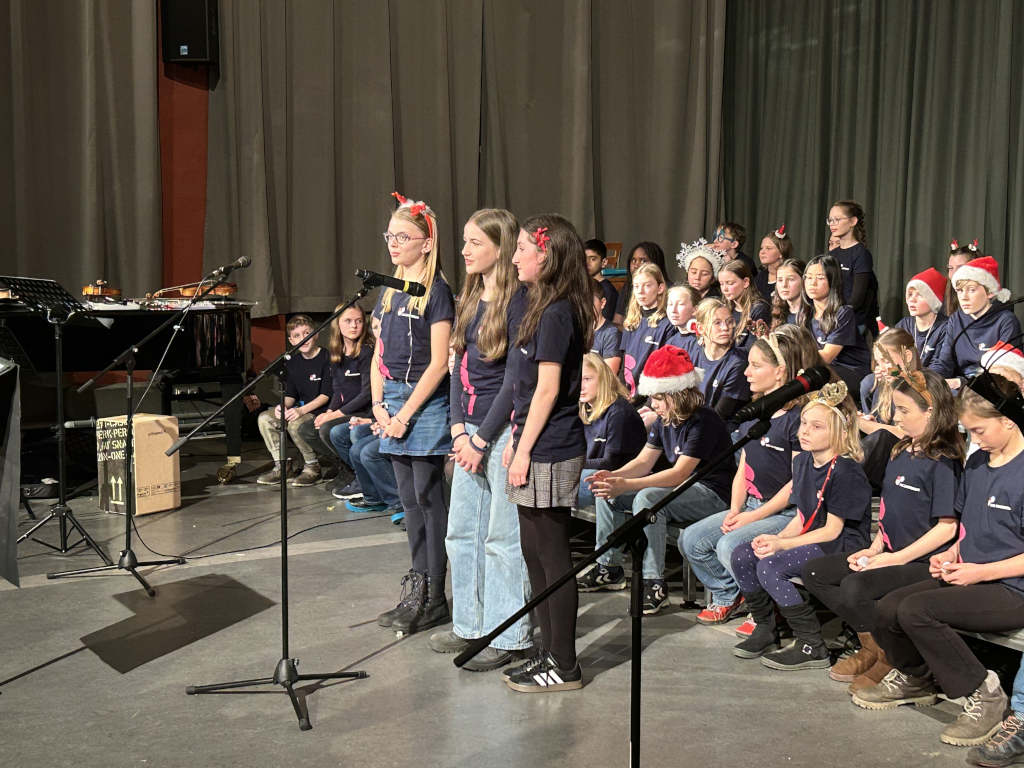 Die Gesangsbeiträge wurden durch Musikstücke und Gedichtvorträge toll ergänzt, so dass für jeden etwas dabei war. Für das leibliche Wohl vor und nach dem Konzert hat der Abiturjahrgang ’25 gesorgt, der auf dem Schulhof einen Weihnachtsmarkt organisiert hat.