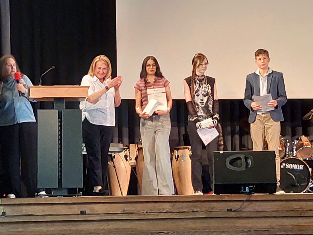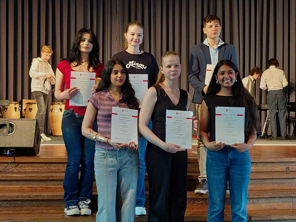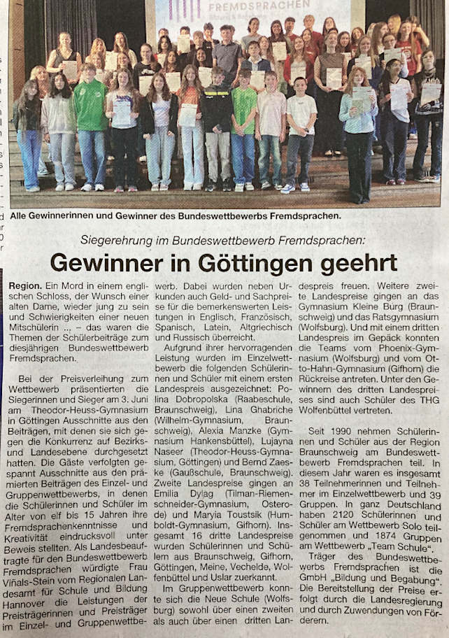 Am 3. Juni fand in Göttingen am Theodor-Heuss-Gymnasium die Preisverleihung des Bundeswettbewerbs Fremdsprachen für den ehemaligen Regierungsbezirk Braunschweig statt. Im Rahmen der unterhaltsam gestalteten Feier konnten Gianice Güth (Jg. 10) und Kavya Gaurav (Jg. 9) zwei dritte Landespreise für Griechisch und Englisch entgegennehmen, Lina Ghabriche (Jg. 10) sogar einen ersten Landespreis für Englisch. Sophie Beyer (Jg. 8) konnte trotz eines Landespreises im Fach Latein leider nicht an der Veranstaltung teilnehmen.