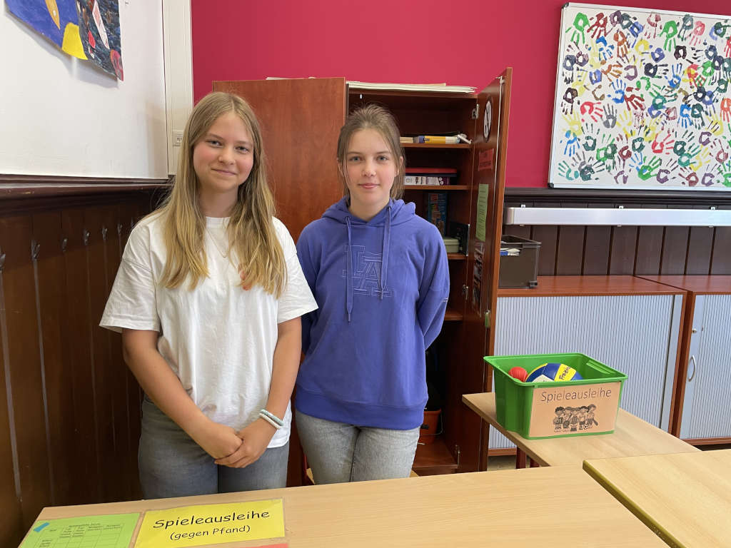 Ihr könnt euch in den Pausen beim Freizeitraum- Team gegen einen Pfand (mit Namen) tolle Spiele ausleihen. Für draußen gibt es für euch neu: einen Fußball, einen Volleyball, Tischtennisschläger, Softbälle, Schwungseil und Gummitwist.