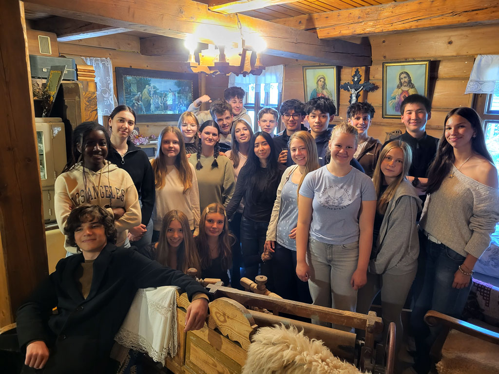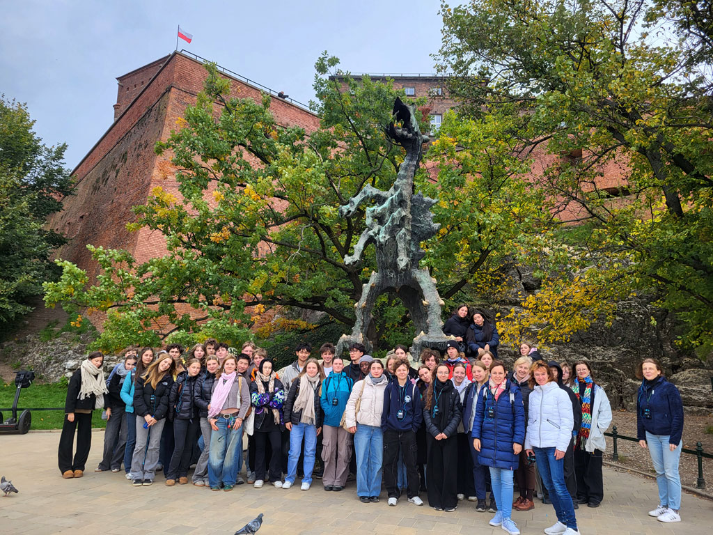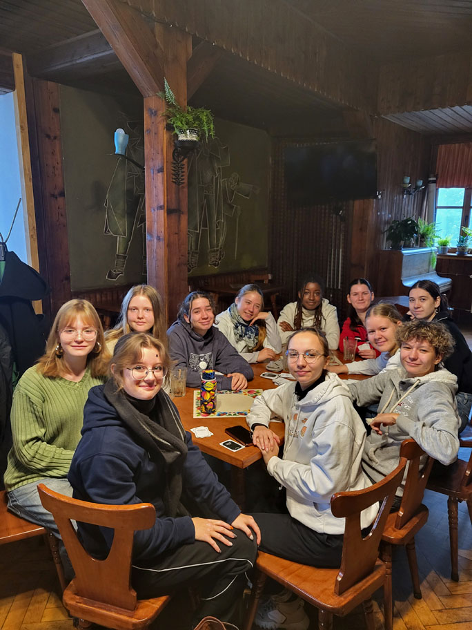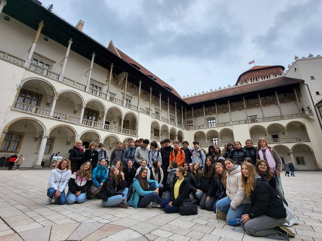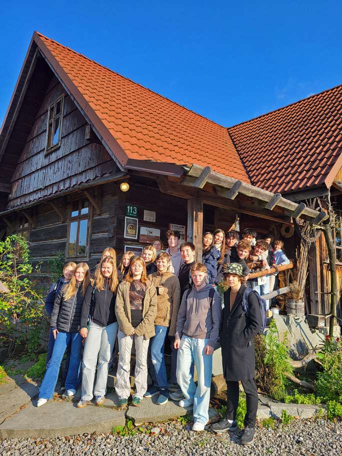 Am ersten Tag wurden wir in der Schule herzlich begrüßt und konnten in Kleingruppen die charmante Altstadt am Fuße der Beskiden kennenlernen. Am nächsten Tag hatten wir die Gelegenheit im Unterricht zu schnuppern. Anschließend machten wir einen Ausflug in ein altes Bauernhaus und lernten dort Butter zu schlagen und eine Art Fladenbrot zu backen und durften das auch verkosten. Am Samstag fuhren wir nach Auschwitz und folgten einer dreistündigen eindrucksvollen Führungen durch das ehemalige Konzentrationslager sowie Birkenau. Am Nachmittag erarbeiteten wir in Kleingruppen mehr zum Schicksal der Kinder in Auschwitz und stellten unsere Ergebnisse vor. Der Sonntag war schließlich unser Familientag und die Familien unternahmen schöne Sachen mit uns: einige fuhren nach Breslau, in das Weltkulturerbe der Salzmine Wieliczka, an die tschechische Grenze, in die Berge etc. Am Montag besichtigten wir die ehemalige Königsstadt Krakau und sahen u.a. das Königsschloss Wawel, die Tuchhallen auf dem Marktplatz oder den Drachen aus der Legende der Stadt. Am letzten Tag sollten wir eigentlich eine Wanderung in den Beskiden machen, aber da es Dauerregen gab, fuhren wir nur mit der Seilbahn auf den Berg und spielten in der Berghütte Gesellschaftsspiele. Abends feierten wir ausgelassen und tanzten auf unserer Abschiedsfeier. Nach einer Woche mussten wir uns verabschieden, doch einige planen bereits ein Wiedersehen, welches ebenfalls durch das Deutsch-Polnische Jugendwerk und das Programm #2amongmillions gefördert werden kann.