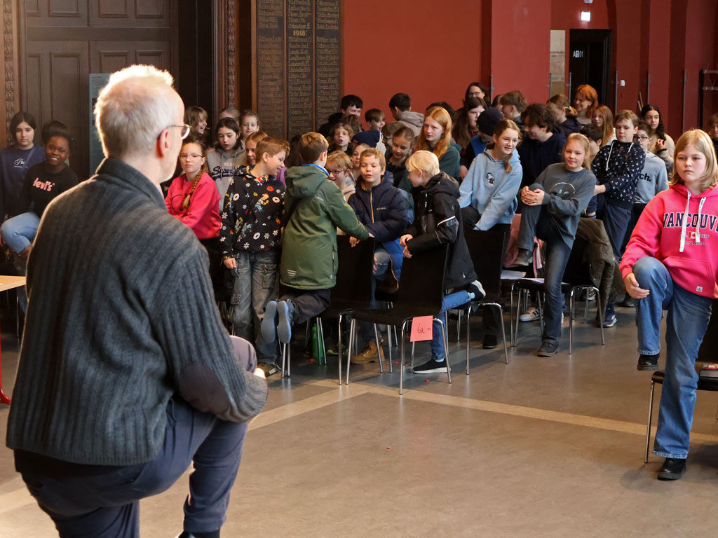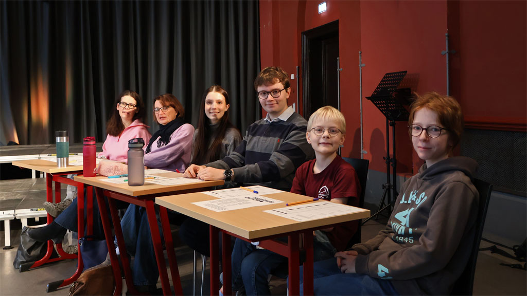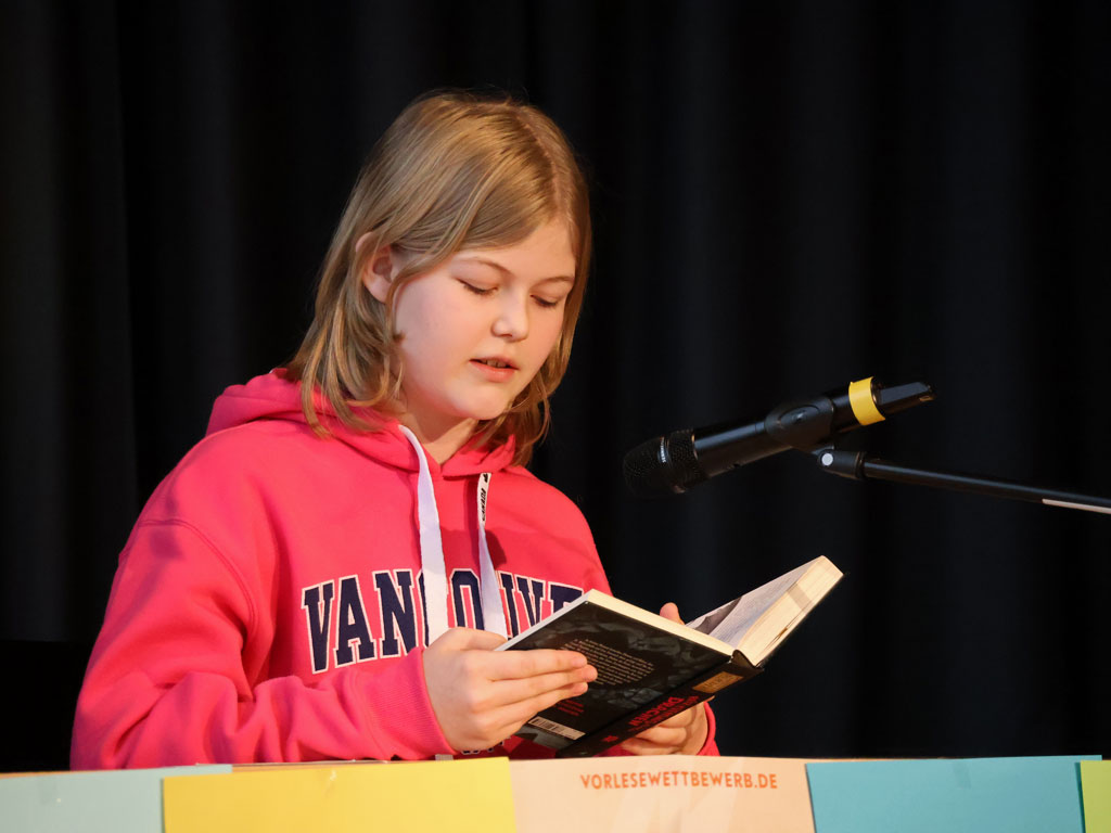 Wie jedes Jahr im Dezember fand am 05. Dezember 2025 der Vorlesewettbewerb der sechsten Klassen des Wilhelm-Gymnasiums statt. Mit ihren vorbereiteten Texten konnten die vier Klassensieger:innen Paulina Schwartz (6a), Johanna Drews (6b), Hendrik Emmerich (6c) und Jorin Uffmann (6d) das Publikum in ihren Bann ziehen. Alle vier Vorleser:innen wurden zu Recht mit tosendem Applaus gefeiert.