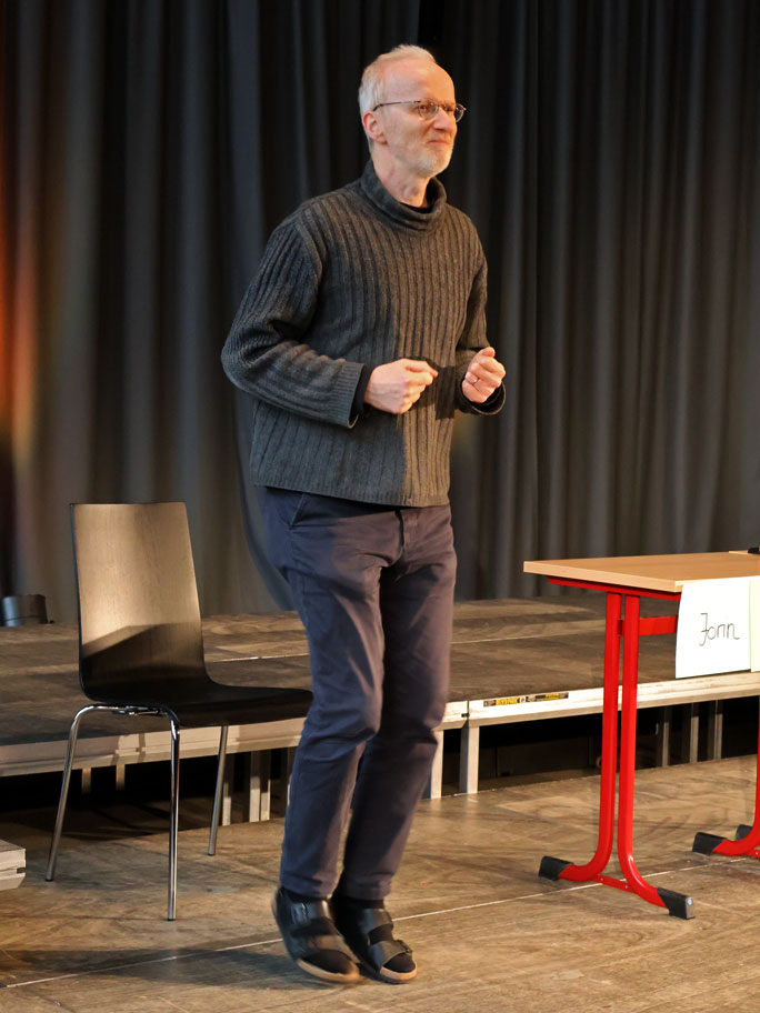 Unterstützung erhielt die Veranstaltung durch eine kompetente Jury: Frau Krüger und Frau Gruffke als Elternvertreterinnen, Magnus Ebel und Luzia Facca als Oberstufenschüler:innen und erfolgreiche Autor:innen und Kalle Wenzel und Benedikt Haase als Vorjahressieger machten sich die Entscheidung nicht leicht. Während die Jury sich beratschlagte, sorgte Herr Kuttig mit einer kleinen Sporteinheit für die Unterhaltung aller Anwesenden.