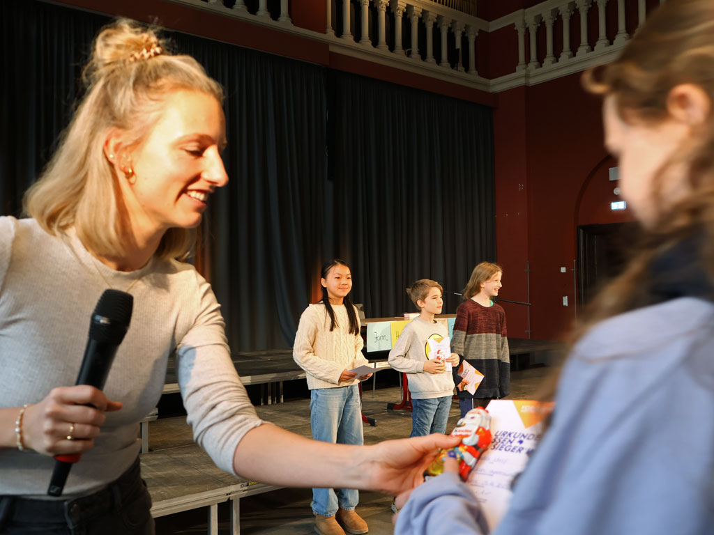 Im Finale traten dann Paulina und Hendrik gegeneinander an, die unvorbereitet aus dem Jugendroman „Der Spurenfinder“ vorlasen und die Zuschauer:innen so erneut in Spannung versetzten. Beide erfüllten die Aufgabe großartig. Schließlich war es aber Hendrik, der sich durchsetzte und unsere Schule nun im kommenden Jahr in der nächsten Runde beim Regionalentscheid vertreten wird. Wir drücken schon jetzt die Daumen!