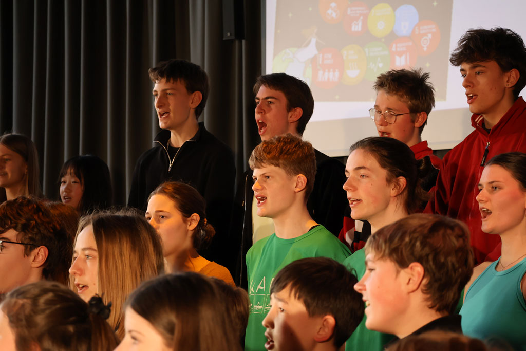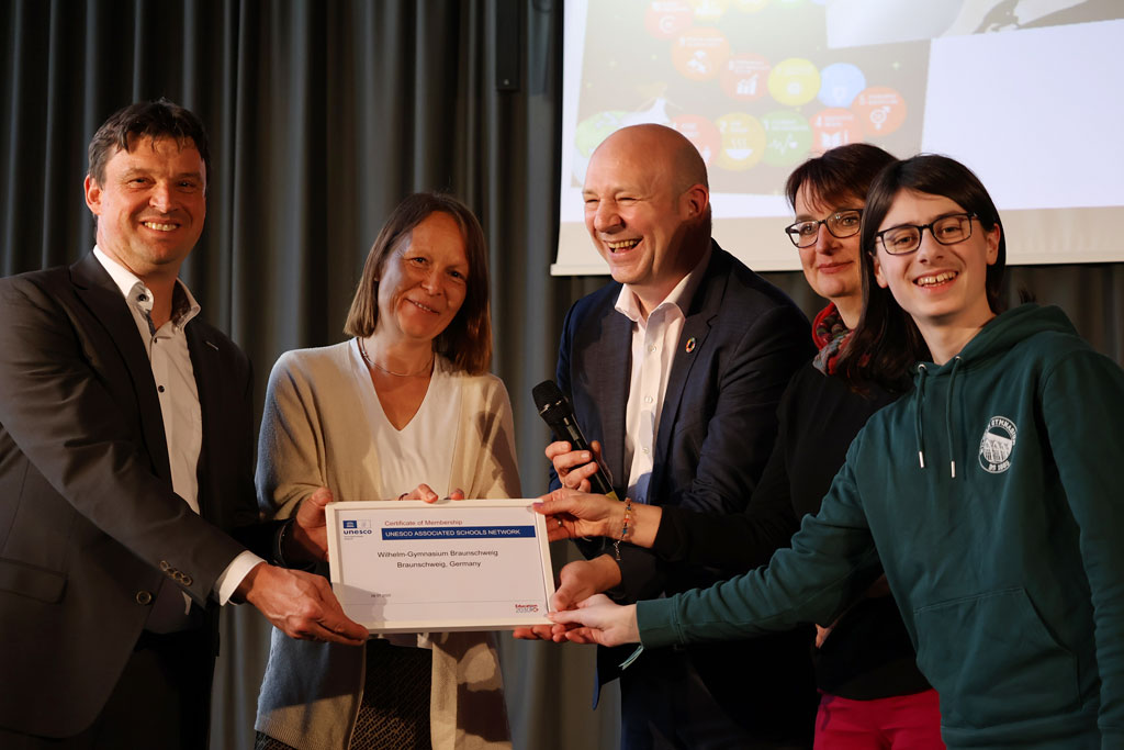 Wir als Schulgemeinschaft freuen uns sehr über diese Auszeichnung und haben aus diesem Grund eine sehr lebendige Anerkennungsfeier erlebt. Den Auftakt in den Nachmittag machte eine Feierstunde in der Aula – mit viel Musik vom WG Cantorum, dem WG Freunde-Chor, die beide von Frau Holzfuß geleitet wurden, und Paul Martin (8ms1) an der Orgel. Viele wertschätzende Reden von unserem Schulleiter Wolfram Bartsch, den UNESCO-Lehrkräften Anne Pfleiderer und Kathleen Winter, Schülersprecher Martino Rossi, den Elternvertreterinnen Alexandra Gruffke und Mascha Fehser sowie den Schülerinnen Leni Kühne und Mia Becker thematisierten unsere Haltung zu den Werten der UNESCO. Das gemeinsame Grußwort von Nina Kossack, UNESCO-Landeskoordinatorin, und Katherina Katechakis, UNESCO-Beauftragte des Niedersächsischen Kultusministeriums, ermutigt uns, den UNESCO-Gedanken an unserer Schule zu leben. Ein Highlight war die feierliche Übergabe der Urkunde durch den Bundeskoordinator, die zu einem echten Mosaikstück dieser wunderschönen Feier wurde. Auch die sehr lebendige Moderation von Katharina Ertelt und Elenore Seidel überzeugte.