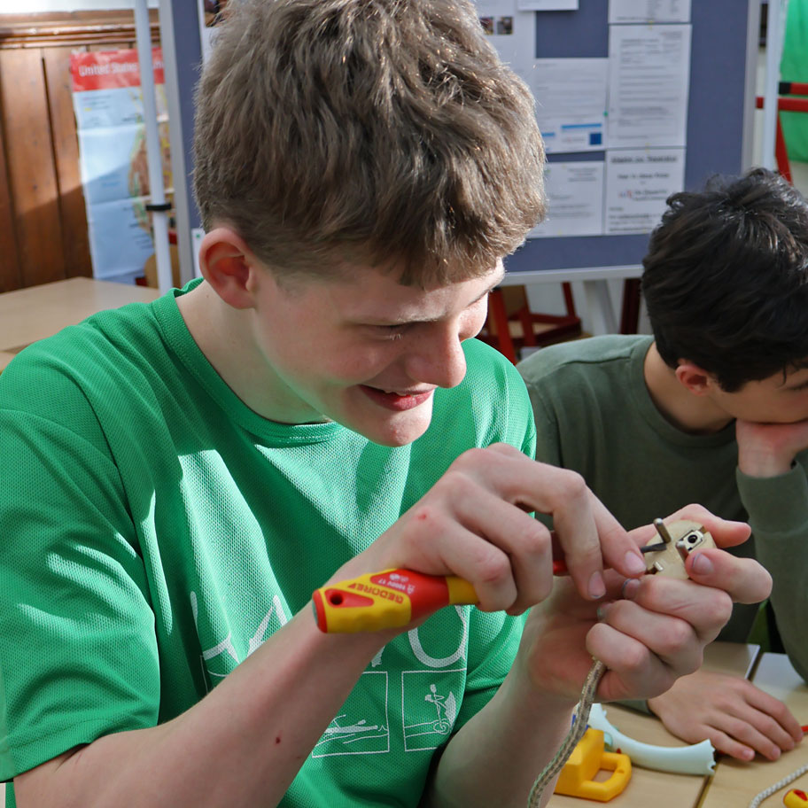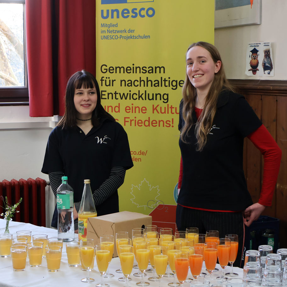Im Anschluss an diese wunderbare Feierstunde war Zeit für einen Austausch mit verschiedenen UNESCO-Projekten an unserer Schule. Dafür konnten die anwesenden Gäste in vielen verschiedenen Räumen die vielfältige Palette an Projekten erleben. Dazu zählen die UNESCO-AG mit Mia Becker, Elenore Seidel, Leni Kühne, Lilith Lübeck, Nathalie Dlugocz und Frau Winter, die Gruppe „mit UNESCO unterwegs am WG“ mit Florian Herbote, Vincent Neumann, Frau Tscherwen, Frau Holland und Frau Reinecke, die Kultur-AG am WG mit Lina Ghabriche und Herrn Öztürk, das Projekt FAZ – „Jugend schreibt“ mit Magnus Ebel und Herrn Vieweg, das Projekt Stolpersteine mit Joris Hack und Frau Conrady, die Repair-AG mit Jasper Labrenz, Ida von Kaehne, Frau Hühnlein und Uwe Heyder, das Projekt Schulgarten mit Jannis Ullrich, Annelie Klebsch, Vincent Wiljes, Vera Göbbel und Herrn Hofmann sowie der „BNE-Gruppe“ (BNE = Bewusst – Nachhaltig – Engagiert: Zukunft lernen) mit dem MINT-Praktikum Jahrgang 10 und Frau Kapsch. Zwischendurch konnte man sich im Lehrerzimmer gegen eine kleine Spende mit leckerem Essen und Getränken vom Jahrgang 12 stärken.