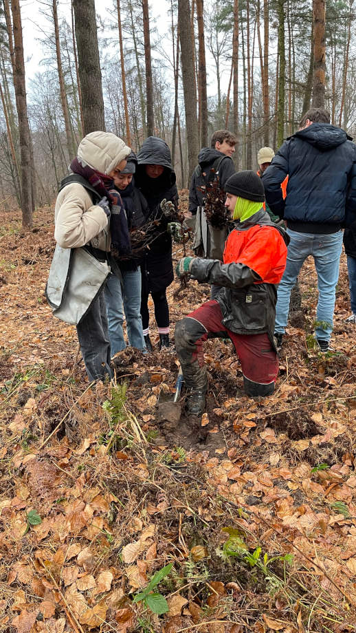 Sehr freundlich und motivierend wurden die Schüler:innen dabei von Herrn Höft (Betriebsdezernent bei den Niedersächsischen Landesforsten) und seinen Mitarbeitenden unterstützt, die mit freundlicher Anleitung sowie Rat und Tat bei den Pflanzungen zur Seite standen. Neben den gespendeten ca. 500 Setzlingen konnten die Schüler:innen weitere knapp 500 Setzlinge in den Boden bringen, die die Landesforsten freundlicherweise zur Verfügung gestellt haben.