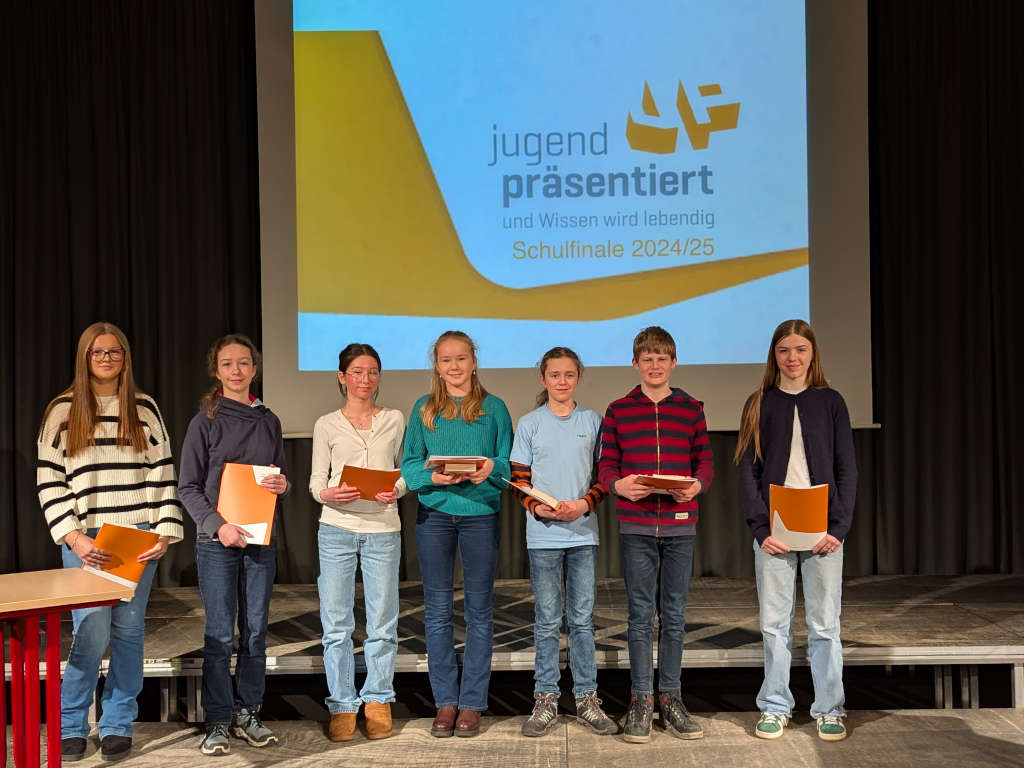 Am 31.01.2025 fand das siebte Jugend präsentiert-Schulfinale am Wilhelm-Gymnasium statt. Die jeweiligen Klassenbesten des 8. Jahrgangs traten in spannenden Präsentationen gegeneinander an – und das vor dem gesamten 8. Jahrgang (und weiteren Gästen) in der großen Aula. Im Vorfeld hatten bereits die 96 SchülerInnen des m-Profils eine Einzelpräsentation vor der eigenen Klasse gehalten.