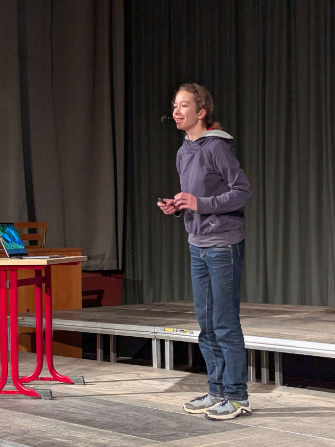 Die Themen der Präsentationen waren sehr vielfältig, so ging es zum Beispiel um die Entsorgung von Atommüll, die Farben des Chamäleons und perfekte Basketballwürfe. Die diesjährige Siegerin war Sophie Beyer (8ms1) mit der Frage „Wie funktioniert die Hautatmung bei Fröschen?“ knapp vor Clara Jerz (8m2; 2. Platz: „Könnten Pommes unsere DNA verändern?“) und Lara Marlen Morese (8m1; 3. Platz: „Die Power der Carbonfaser – welche Auswirkungen haben Carbonfasern in Schwimmbekleidung auf das Schwimmen?“). Alle TeilnehmerInnen am Schulfinale haben jeweils eine Urkunde und einen Buchpreis erhalten.