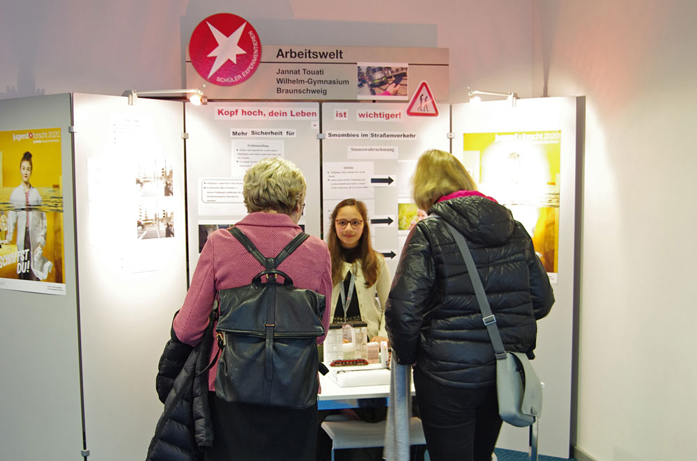 Jannat aus der 5b ist dieses Jahr zum ersten Mal angetreten und konnte sich gleich über einen zweiten Platz im Fachgebiet Arbeitswelt freuen. Sie hatte beobachtet, dass es in Braunschweig Verkehrssituationen gibt, wo Fußgänger trotz Grünphase mit Straßenbahnen in Konflikt geraten können. Mit ihrem Projekt „Wie können wir Straßenbahnüberquerungen für Fußgänger sicherer gestalten?“ entwickelte sie Lösungsansätze wie in Zeiten intensiv und überall genutzter Smartphones die Unfallgefahr minimiert werden könnte.