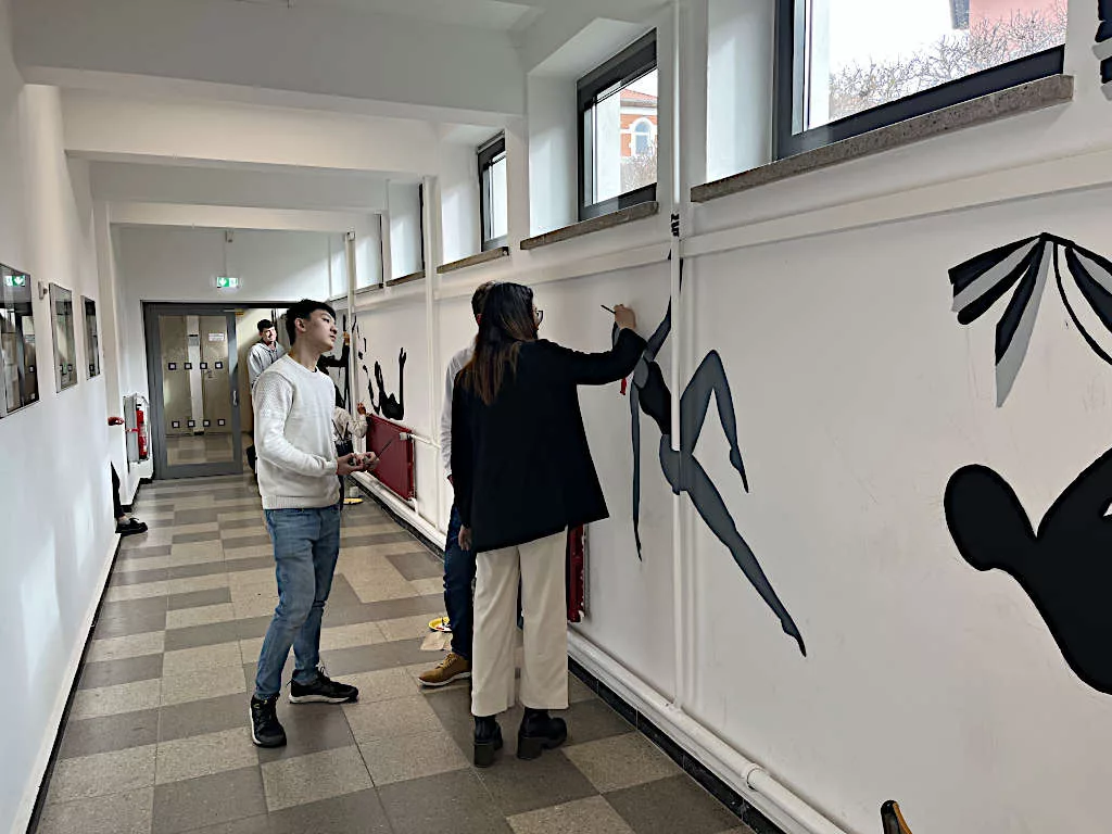 Im März gestalteten die Grundkurse aus Jahrgang 12 und 13 von Fr. Watermülder und Fr. Lorenz als gemeinsame Projektarbeit den Kunsttrakt, der in dem Jahr zuvor brandschutzsaniert und neu geweißt wurde. Da ein Weiß an Wänden zwar frisch, mitunter aber auch steril anmutet, sollte recht zügig eine Wandbemalung her. Wünschenswert dabei war, dass Figuren als Silhouetten abgebildet werden und Bezug zum ausgewählten Ort nehmen. Die Bemalung in verschiedenen Grautönen sowie Schwarz erhält durch wenig Bunt Akzente, so dass die Größe der Figuren nicht aufdringlich wirkt. Die beigefügten Fotos zeigen die Schüler in Aktion.