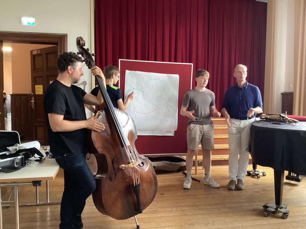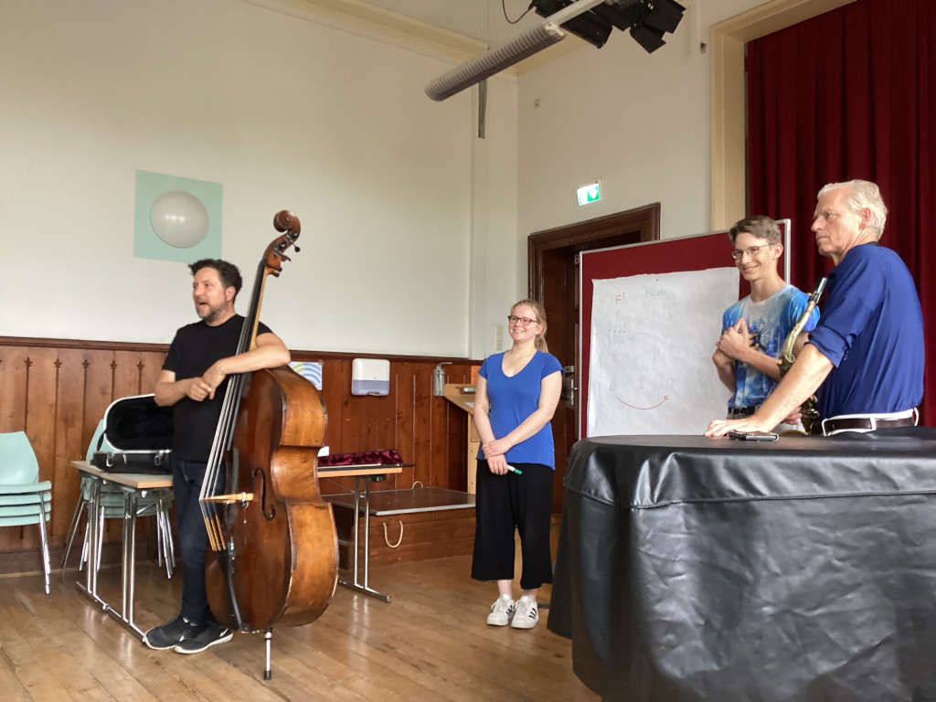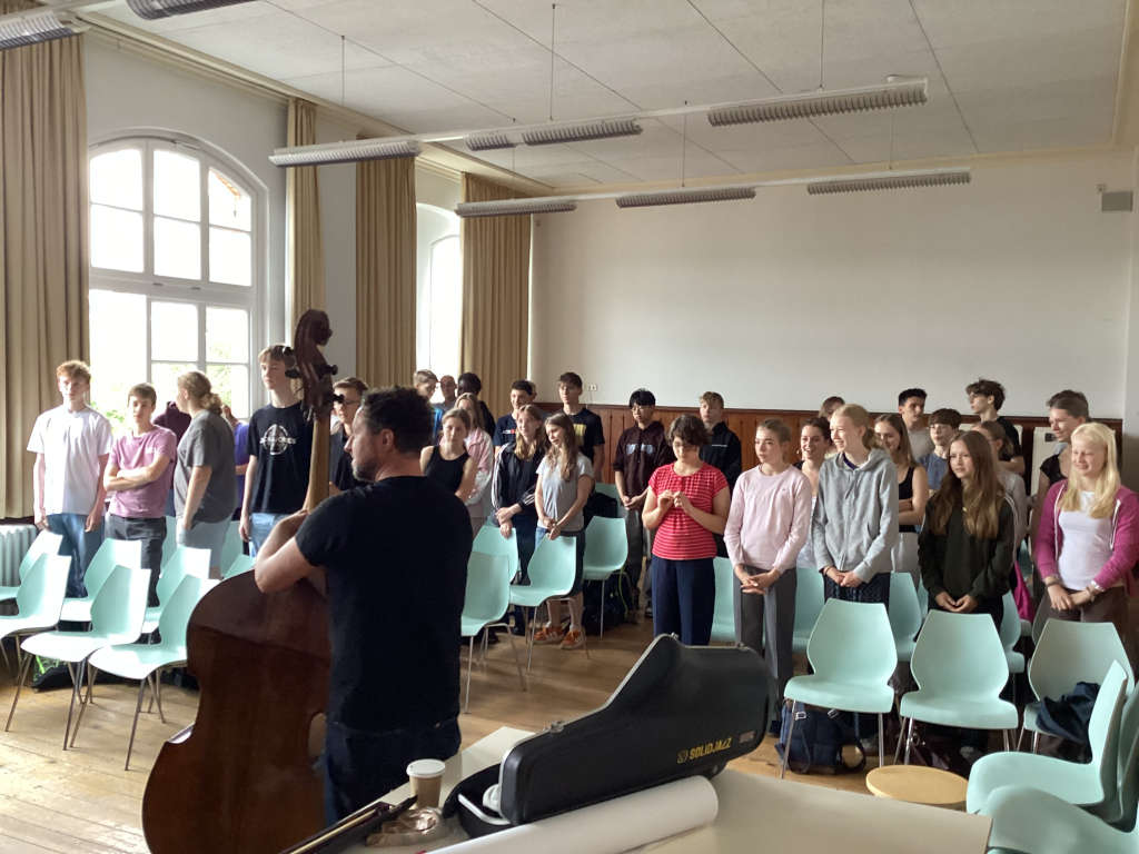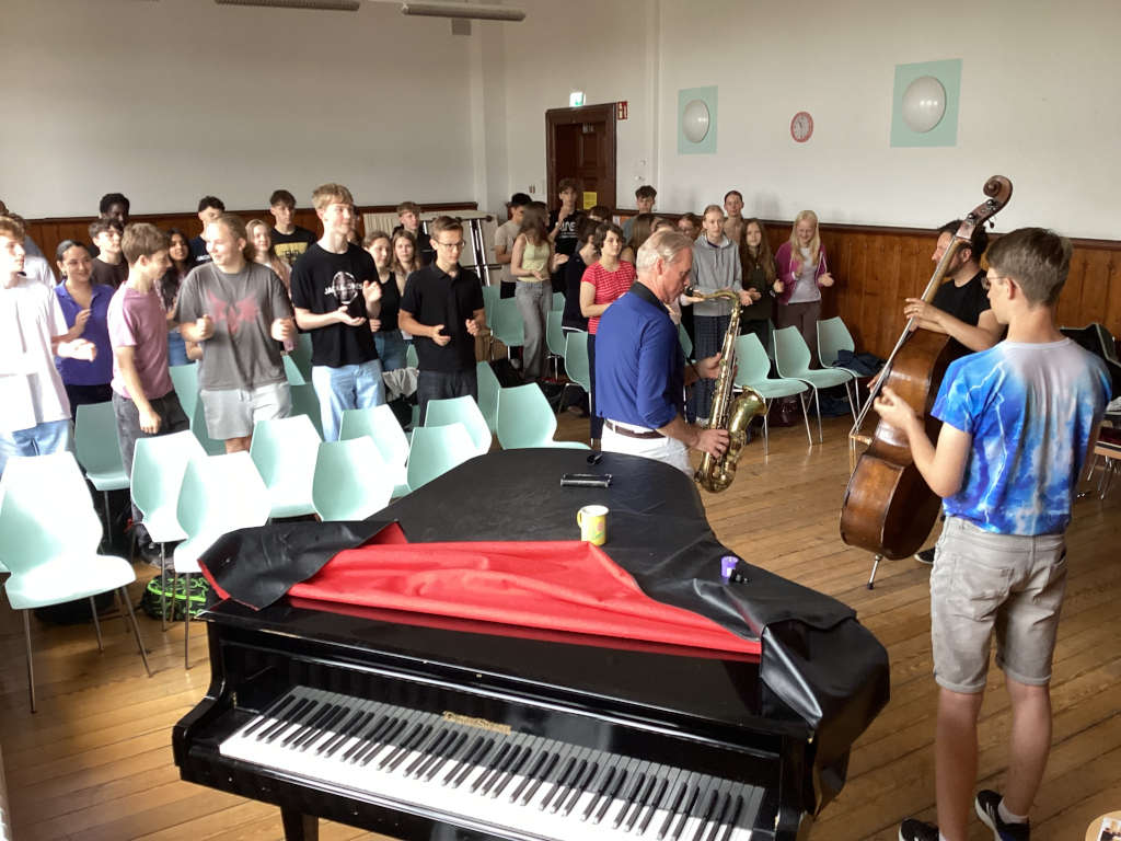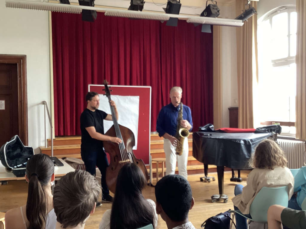 “Am Freitag, den 27.6., waren Alexander Hartmann und Peter Schwebs bei uns in der Schule. Sie haben uns im Rahmen des Projekts „Jazz2school“ den Jazz genauer erklärt und ein paar Praxis-Beispiele am Saxofon und am Kontrabass gezeigt. Wir werden weiterhin Jazz im Alltag erleben und nun auch wissen wie dieser entstand.“ (Ilvy Haro und Charlotte Ansorge, 9ms1)