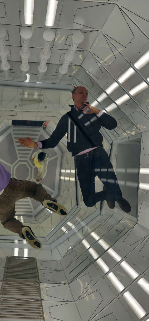 Die Ausstellung war voller faszinierender Installationen, die unsere Wahrnehmung herausforderten. Besonders eindrucksvoll war eine Rakete, in der durch geschickte Spiegelungen der Eindruck entstand, dass man die Orientierung verliert und tatsächlich schwebt. Ein weiteres Highlight war ein Haus, das in einem surrealen Winkel scheinbar in der Luft balancierte.