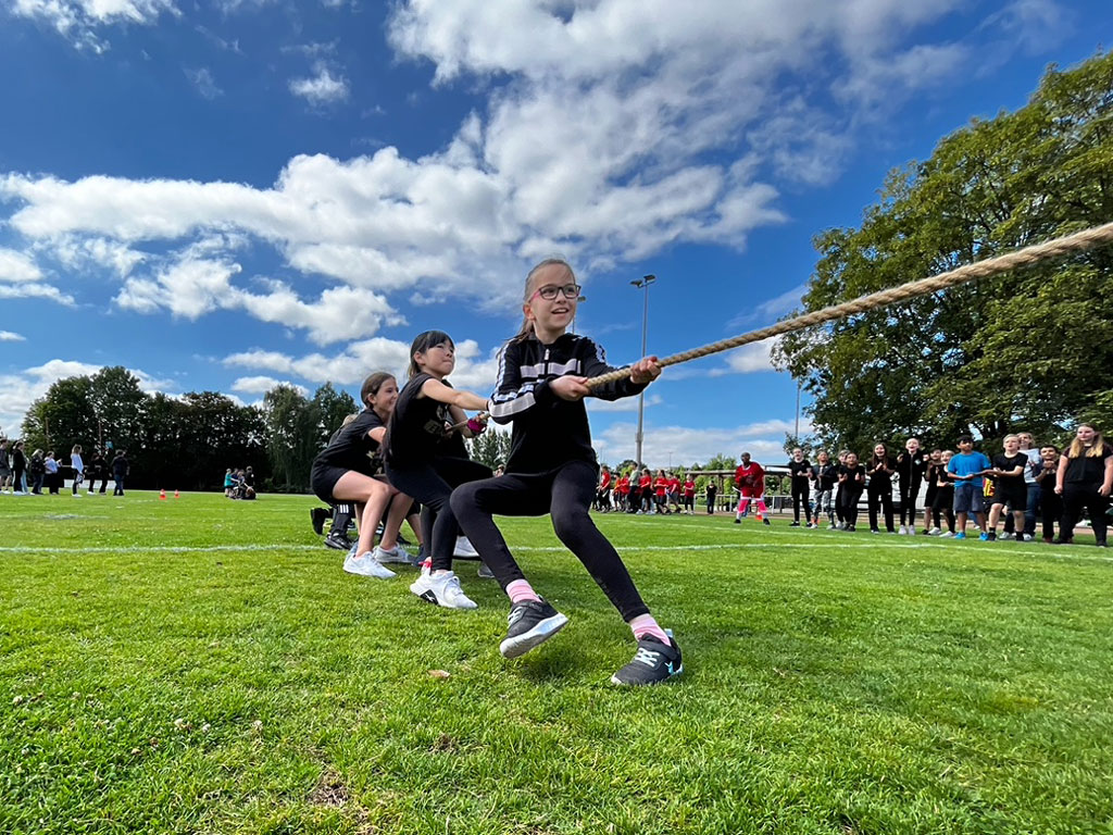 Nun heißt es in diesem Schuljahr endlich wieder: Gemeinsam laufen, springen, werfen, stoßen und vor allem Spaß haben. Am kommenden Freitag (08.07.2022) treffen sich alle 5. und 6. Klassen auf dem Sportplatz „Rote Wiese“, um die verschiedensten Disziplinen gemeinsam mit der ganzen Klasse zu meistern. Nicht nur bei dem beliebten Tauziehen kommt es darauf an, gemeinsam „anzupacken“ – bei allen Wettkämpfen steht der Teamgeist im Mittelpunkt und so freut sich die Fachgruppe Sport auf einen ereignisreichen und sportlichen Tag.