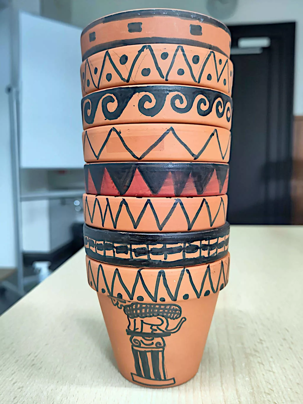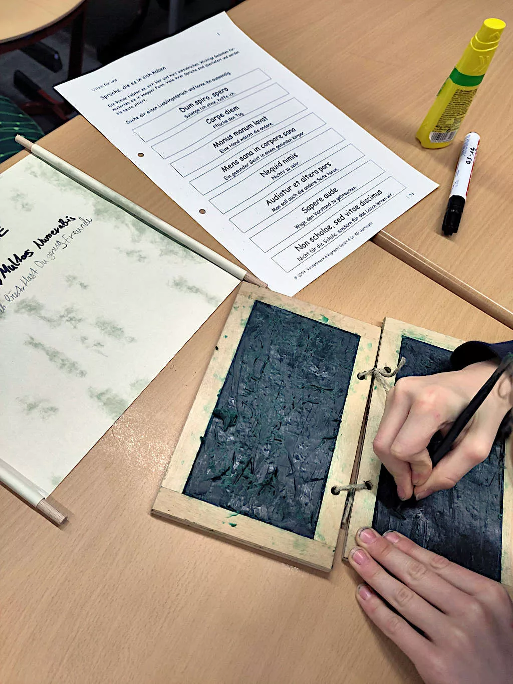 Hier beschäftigen sich die Grundschüler*innen mit der Sprache und Kultur der Römer und Griechen, z. B. Alltagsleben, Schrift und Mythen. Einen großen Teil nehmen auch kreative Elemente ein: So haben wir im vergangenen Schuljahr z. B. Schriftrollen mit lateinischen Sprüchen gestaltet, Stoffbeutel mit antiken Mustern verziert und Tontöpfe mit antiken Vasenmotiven bemalt.