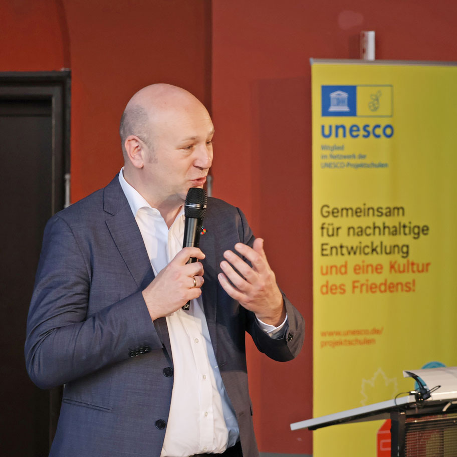 Toleranz, Vielfalt, Demokratie, Nachhaltigkeit, Menschenrechte, Gemeinschaft – das haben wir an unserer Schule schon immer gelebt. Mit unserer Anerkennungsfeier als UNESCO-Projektschule am Donnerstag, den 12. März 2026 haben wir vom Bundeskoordinator der UNESCO-Projektschulen, Klaus Schilling, die Bestätigung für unser langjähriges Engagement erhalten. Wir sehen dies als Auftrag, uns nun mit noch stärkerem Engagement für diese Werte an unserer Schule einzusetzen.