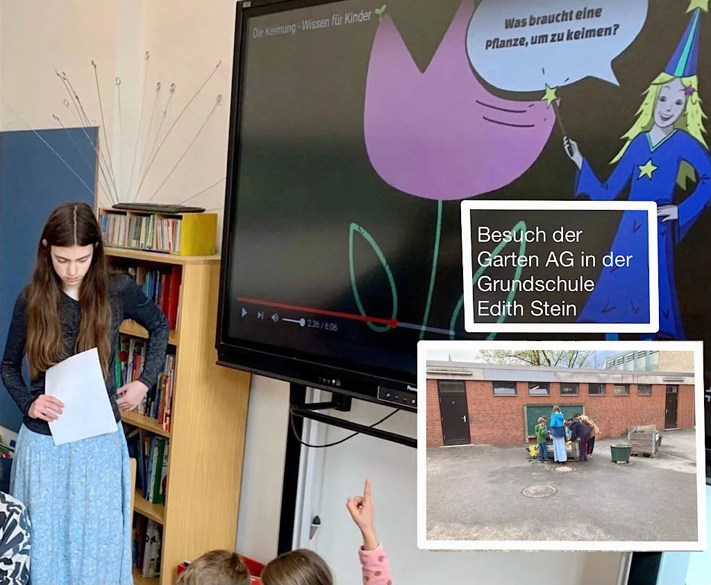 Das Thema Keimung bot dementsprechend den Ansatz für eine Kooperation mit der Edith Stein Grundschule. Schüler unserer Garten-AG besuchten eine dritte Klasse und informierten über die Keimung. Im Anschluss säten sie mit einigen Grundschülern Radieschen und Salat in einem Hochbeet aus. Wir freuen uns auf weitere gemeinsame Aktionen!