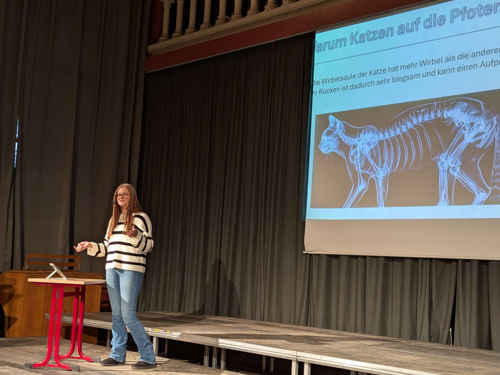 Die Themen der Präsentationen waren sehr vielfältig, so ging es zum Beispiel um die Entsorgung von Atommüll, die Farben des Chamäleons und perfekte Basketballwürfe. Die diesjährige Siegerin war Sophie Beyer (8ms1) mit der Frage „Wie funktioniert die Hautatmung bei Fröschen?“ knapp vor Clara Jerz (8m2; 2. Platz: „Könnten Pommes unsere DNA verändern?“) und Lara Marlen Morese (8m1; 3. Platz: „Die Power der Carbonfaser – welche Auswirkungen haben Carbonfasern in Schwimmbekleidung auf das Schwimmen?“). Alle TeilnehmerInnen am Schulfinale haben jeweils eine Urkunde und einen Buchpreis erhalten.