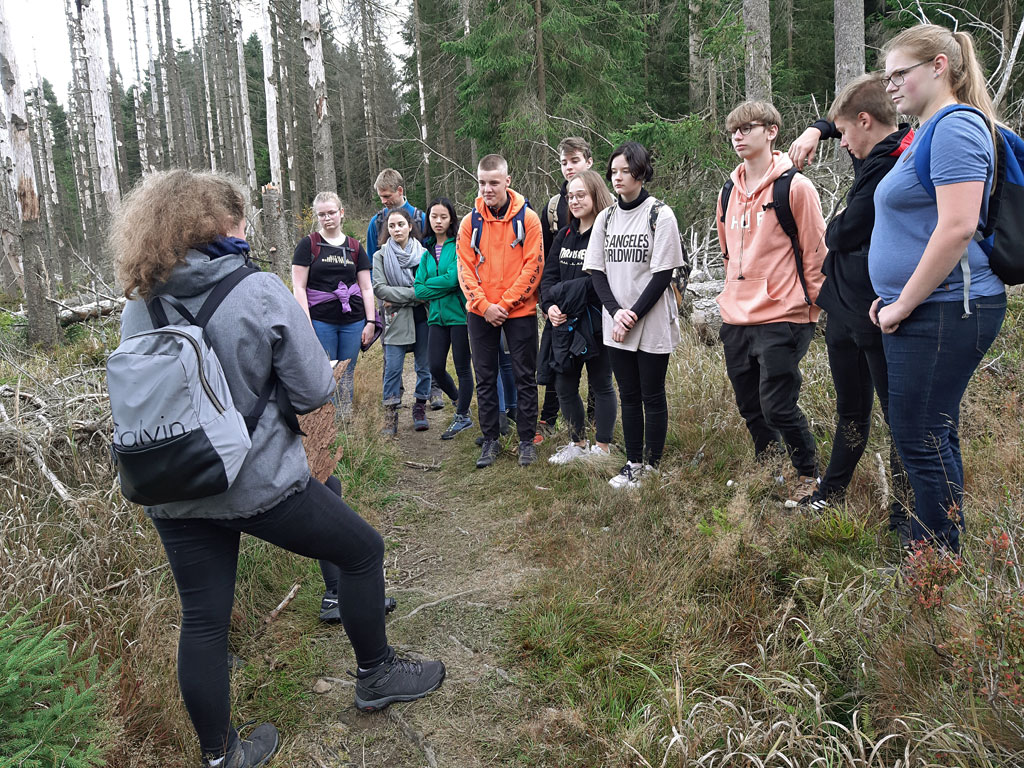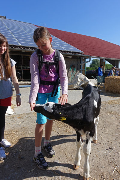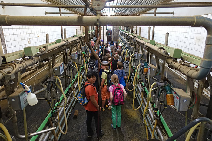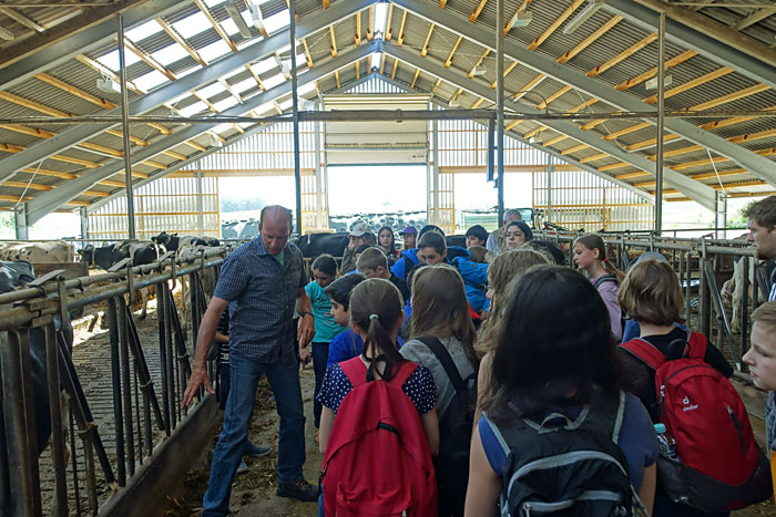 In einer ca. 2-stündigen Führung lernen die Schülerinnen und Schüler einen modernen Milchbauernhof kennen: Kälberstall, Melkstand, richtige und zum Teil computergesteuerte Fütterung, eigene Futterproduktion, artgerechte Tierhaltung im offenen Freilaufstall mit Stroh und direkt zum Stall zugehöriger Weide, eigene Molkerei mit regionaler Vermarktung.